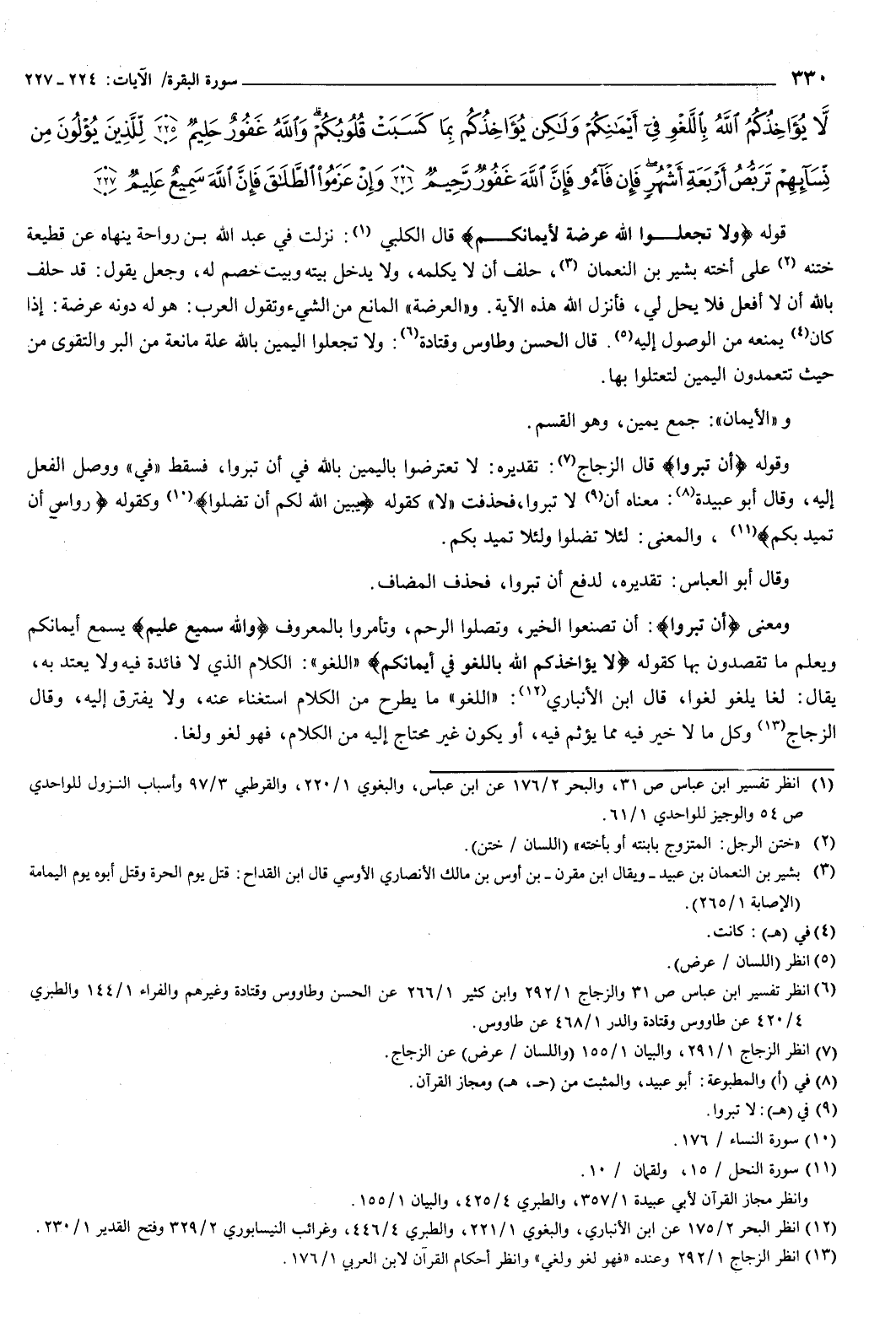 لا يُؤَاخِذُكُمُ اللَّهُ بِاللَّغْوِ فِي أَيْمَانِكُمْ وَلَكِنْ يُؤَاخِذُكُمْ بِمَا كَسَبَتْ قُلُوبُكُمْ وَاللَّهُ غَفُورٌ حَلِيمٌ {225} لِلَّذِينَ يُؤْلُونَ مِنْ نِسَائِهِمْ تَرَبُّصُ أَرْبَعَةِ أَشْهُرٍ فَإِنْ فَاءُوا فَإِنَّ اللَّهَ غَفُورٌ رَحِيمٌ {226} وَإِنْ عَزَمُوا الطَّلاقَ فَإِنَّ اللَّهَ سَمِيعٌ عَلِيمٌ {227} } [البقرة: 224-227] قوله: {وَلا تَجْعَلُوا اللَّهَ عُرْضَةً لأَيْمَانِكُمْ} [البقرة: 224] قال الكلبي: نزلت في عبد الله بن رواحة، ينهاه عن قطيعة ختنه على أخته بشير بن النعمان، حلف أن لا يكلمه، ولا يدخل بيته وبيت خصم له، وجعل يقول: قد حلفت بالله أن لا أفعل، فلا يحل لي.