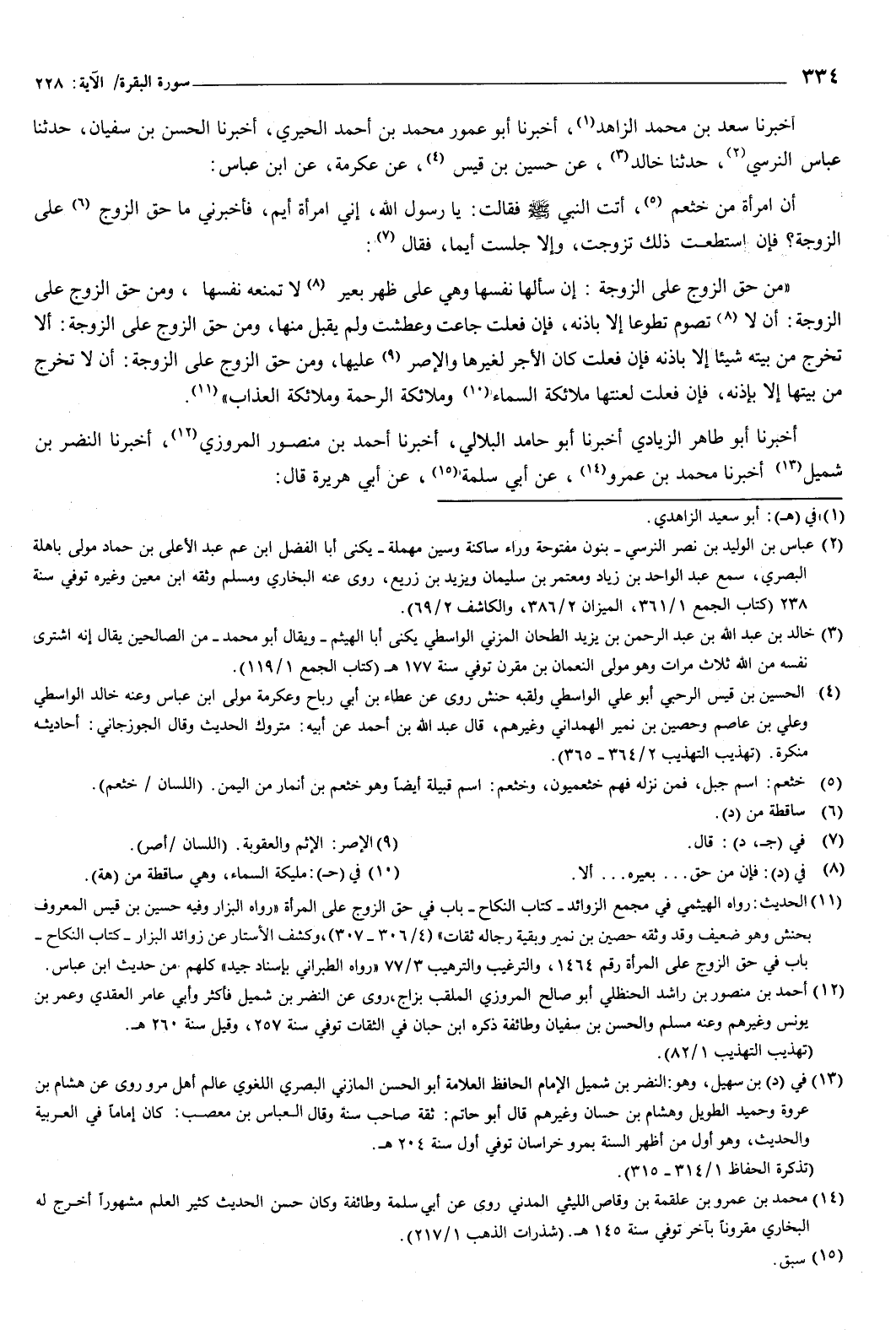 108 - أَخْبَرَنَا سَعْدُ بْنُ مُحَمَّدٍ الزَّاهِدُ، أَخْبَرَنَا أَبُو عَمْرٍو مُحَمَّدُ بْنُ أَحْمَدَ الْحِيرِيُّ، أَخْبَرَنَا الْحَسَنُ بْنُ سُفْيَانَ، حَدَّثَنَا عَبَّاسٌ النَّرْسِيُّ، حَدَّثَنَا خَالِدٌ، عَنْ حُسَيْنِ بْنِ قَيْسٍ، عَنْ عِكْرِمَةَ، عَنِ ابْنِ عَبَّاسٍ: أَنَّ امْرَأَةً مِنْ خَثْعَمٍ، أَتَتِ النَّبِيَّ صَلَّى اللهُ عَلَيْهِ وَسَلَّمَ، فَقَالَتْ: يَا رَسُولَ اللَّهِ، إِنِّي امْرَأَةٌ أَيِّمٌ، فَأَخْبِرْنِي مَا حَقُّ الزَّوْجِ عَلَى الزَّوْجَةِ؟ فَإِنِ اسْتَطَعْتُ ذَلِكَ تَزَوَّجْتُ، وَإِلا جَلَسْتُ أَيِّمًا، فَقَالَ: " مِنْ حَقِّ الزَّوْجِ عَلَى الزَّوْجَةِ: إِنْ سَأَلَهَا نَفْسَهَا وَهِيَ عَلَى ظَهْرِ بَعِيرٍ لا تَمْنَعُهُ نَفْسَهَا، وَمِنْ حَقِّ الزَّوْجِ عَلَى الزَّوْجَةِ: أَنْ لا تَصُومَ تَطَوُّعًا إِلا بِإِذْنِهِ، فَإِنْ فَعَلَتْ جَاعَتْ وَعَطِشَتْ وَلَمْ يُقْبَلْ مِنْهَا، وَمِنْ حَقِّ الزَّوْجِ عَلَى الزَّوْجَةِ: أَلا تُخْرِجَ مِنْ بَيْتِهِ شَيْئًا إِلا بِإِذْنِهِ فَإِنْ فَعَلَتْ كَانَ الأَجْرُ لِغَيْرِهَا وَالإِصْرُ عَلَيْهَا، وَمِنْ حَقِّ الزَّوْجِ عَلَى الزَّوْجَةِ: أَنْ لا تَخْرُجَ مِنْ بَيْتِهَا إِلا بِإِذْنِهِ، فَإِنْ فَعَلَتْ لَعَنَتْهَا مَلائِكَةُ السَّمَاءِ وَمَلائِكَةُ الرَّحْمَةِ وَمَلائِكَةُ الْعَذَابِ "