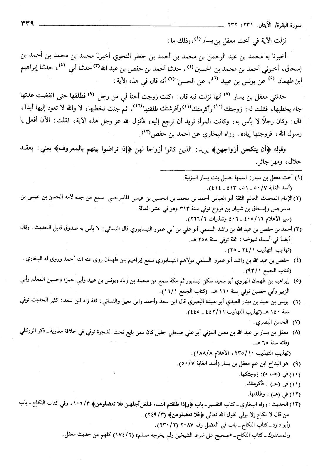 111 - أَخْبَرَنَا بِهِ مُحَمَّدُ بْنُ عَبْدِ الرَّحْمَنِ بْنِ مُحَمَّدِ بْنِ أَحْمَدَ بْنِ جَعْفَرٍ النَّحْوِيُّ، أَخْبَرَنَا مُحَمَّدُ بْنُ مُحَمَّدِ بْنِ أَحْمَدَ بْنِ إِسْحَاقَ، أَخْبَرَنِي أَحْمَدُ بْنُ مُحَمَّدِ بْنِ الْحُسَيْنِ، حَدَّثَنَا أَحْمَدُ بْنُ حَفْصِ بْنِ عَبْدِ اللَّهِ، حَدَّثَنَا أَبِي، حَدَّثَنَا إِبْرَاهِيمُ بْنُ طَهْمَانَ، عَنْ يُونُسَ بْنِ عُبَيْدٍ، عَنِ الْحَسَنِ أَنَّهُ قَالَ فِي هَذِهِ الآيَةِ: حَدَّثَنِي مَعْقِلُ بْنُ يَسَارٍ أَنَّهَا نَزَلَتْ فِيهِ، قَالَ: " كُنْتُ زَوَّجْتُ أُخْتًا لِي مِنْ رَجُلٍ فَطَلَّقَهَا حَتَّى انْقَضَتْ عِدَّتُهَا جَاءَ يَخْطُبُهَا، فَقُلْتُ لَهُ: زَوَّجْتُكَ وَأَكْرَمْتُكَ وَأَفْرَشْتُكَ ثُمَّ طَلَّقْتَهَا، ثُمَّ جِئْتَ تَخْطُبُهَا، لا وَاللَّهِ لا تَعُودُ إِلَيْهَا أَبَدًا، قَالَ: وَكَانَ رَجُلا لا بَأْسَ بِهِ، وَكَانَتِ الْمَرْأَةُ تُرِيدُ أَنْ تَرْجِعَ إِلَيْهِ، فَأَنْزَلَ اللَّهُ عَزَّ وَجَلَّ هَذِهِ الآيَةَ، فَقُلْتُ: الآنَ أَفْعَلُ يَا رَسُولَ اللَّهِ، فَزَوَّجْتُهَا إِيَّاهُ ".
