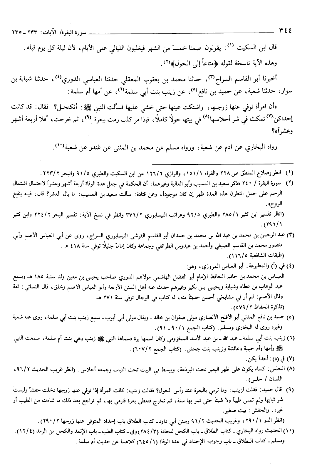112 - أَخْبَرَنَا أَبُو الْقَاسِمِ السَّرَّاجُ، حَدَّثَنَا مُحَمَّدُ بْنُ يَعْقُوبَ الْمَعْقِلِيُّ، حَدَّثَنَا الْعَبَّاسِيُّ الدُّورِيُّ، حَدَّثَنَا شَبَابَةُ بْنُ سَوَّارٍ، حَدَّثَنَا شُعْبَةُ، عَنْ حُمَيْدِ بْنِ نَافِعٍ، عَنْ زَيْنَبَ بِنْتِ أَبِي سَلَمَةَ، عَنْ أُمِّهَا أُمِّ سَلَمَةَ: " أَنَّ امْرَأَةً تُوُفِّيَ عَنْهَا زَوْجُهَا، وَاشْتَكَتْ عَيْنَهَا حَتَّى خُشِيَ عَلَيْهَا فَسَأَلَتِ النَّبِيَّ صَلَّى اللهُ عَلَيْهِ وَسَلَّمَ: أَنَكْتَحِلُ؟ فَقَالَ: قَدْ كَانَتْ إِحْدَاكُنَّ تَمْكُثُ فِي شَرِّ أَحْلاسِهَا فِي بَيْتِهَا حَوْلا كَامِلا، فَإِذَا مَرَّ كَلْبٌ رَمَتْ بِبَعْرَةٍ، ثُمَّ خَرَجَتْ، أَفَلا أَرْبَعَةَ أَشْهُرٍ وَعَشْرًا "؟ ، رَوَاهُ الْبُخَارِيُّ، عَنْ آدَمَ، عَنْ شُعْبَةَ، وَرَوَاهُ مُسْلِمٌ، عَنْ مُحَمَّدِ بْنِ الْمُثَنَّى، عَنْ غُنْدَرٍ، عَنْ شُعْبَةَ