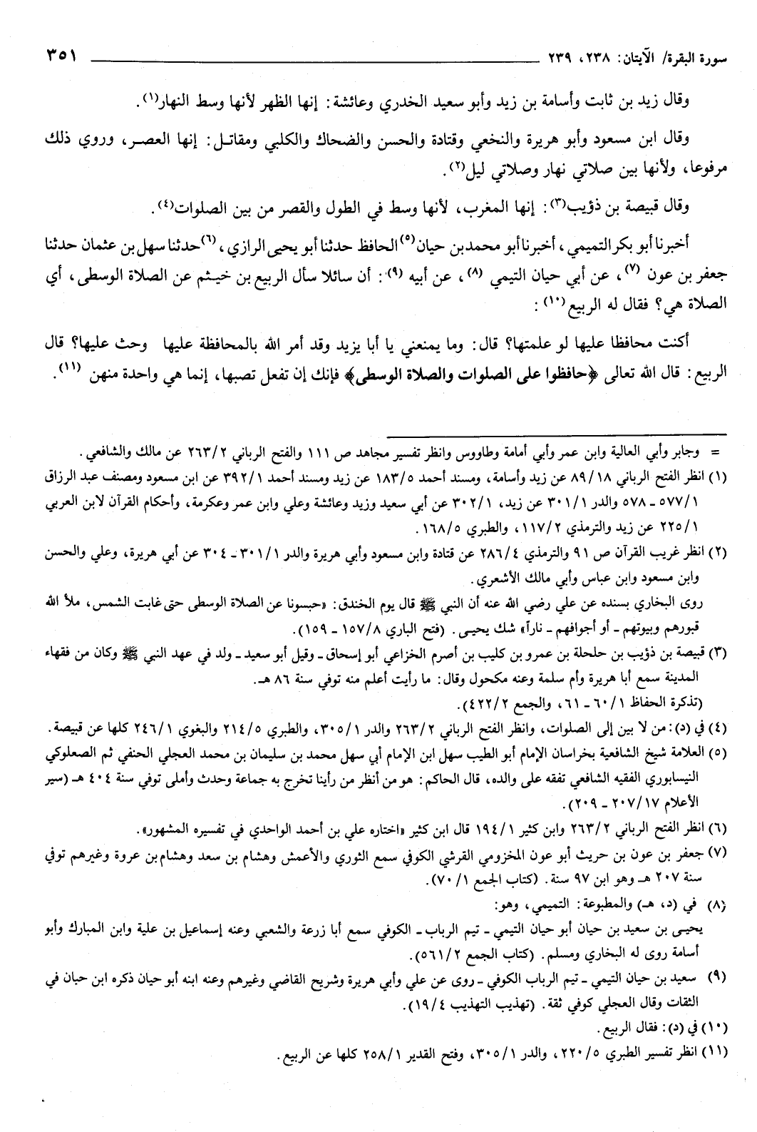 أخبرنا أبو بكر التميمي، أخبرنا أبو محمد بن حيان الحافظ، حدثنا أبو يحيى الرازي، حدثنا سهل بن عثمان، حدثنا جعفر بن عون، عن أبي حيان التيمي، عن أبيه: أن سائلا سأل الربيع بن خيثم عن الصلاة الوسطى، أي الصلاة هي؟ فقال له الربيع: أكنت محافظا عليها لو علمتها؟ قال: وما يمنعني يا أبا يزيد وقد أمر الله بالمحافظة عليها وحث عليها؟ قال الربيع: قال الله تعالى: {حَافِظُوا عَلَى الصَّلَوَاتِ وَالصَّلاةِ الْوُسْطَى} [البقرة: 238] فإنك إن تفعل تصبها، إنما هي واحدة منهن.