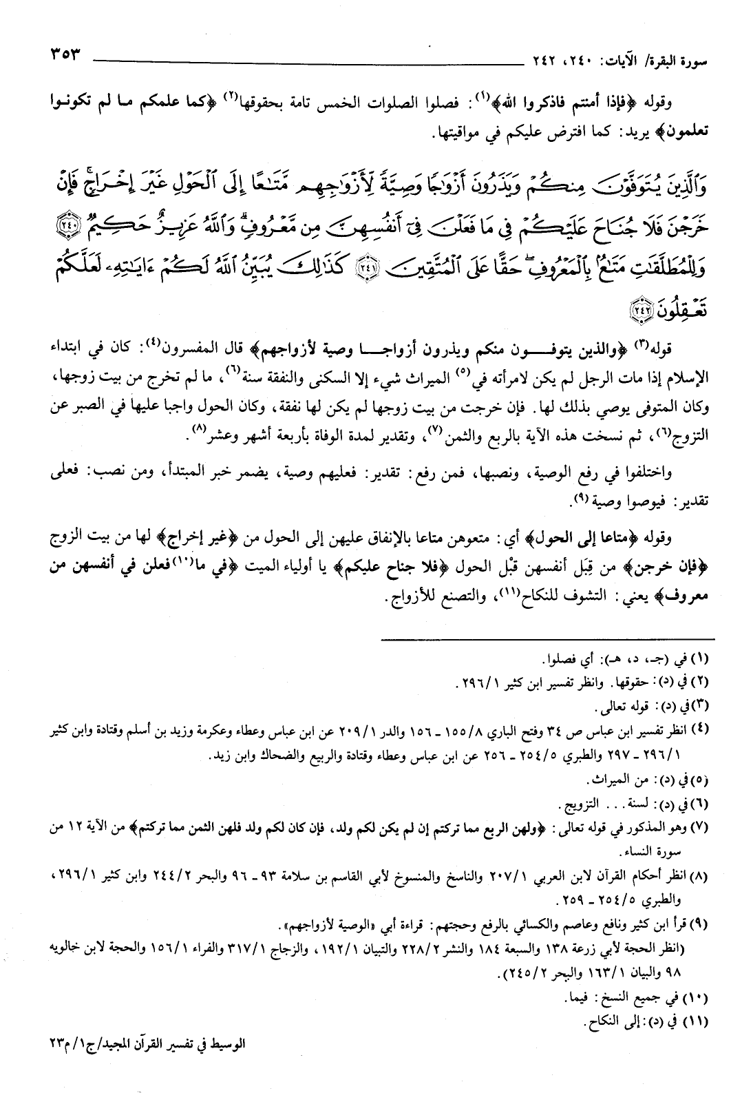 {وَالَّذِينَ يُتَوَفَّوْنَ مِنْكُمْ وَيَذَرُونَ أَزْوَاجًا وَصِيَّةً لأَزْوَاجِهِمْ مَتَاعًا إِلَى الْحَوْلِ غَيْرَ إِخْرَاجٍ فَإِنْ خَرَجْنَ فَلا جُنَاحَ عَلَيْكُمْ فِي مَا فَعَلْنَ فِي أَنْفُسِهِنَّ مِنْ مَعْرُوفٍ وَاللَّهُ عَزِيزٌ حَكِيمٌ {240} وَلِلْمُطَلَّقَاتِ مَتَاعٌ بِالْمَعْرُوفِ حَقًّا عَلَى الْمُتَّقِينَ {241} كَذَلِكَ يُبَيِّنُ اللَّهُ لَكُمْ آيَاتِهِ لَعَلَّكُمْ تَعْقِلُونَ {242} } [البقرة: 240-242] قوله: {وَالَّذِينَ يُتَوَفَّوْنَ مِنْكُمْ وَيَذَرُونَ أَزْوَاجًا وَصِيَّةً لأَزْوَاجِهِمْ} [البقرة: 240] قال المفسرون: كان في ابتداء الإسلام إذا مات الرجل لم يكن لامرأته في الميراث شيء إلا السكنى والنفقة سنة ما لم تخرج من بيت زوجها، وكان المتوفى يوصي بذلك لها، فإن خرجت من بيت زوجها لم يكن لها نفقة، وكان الحول واجبا عليها في الصبر عن التزوج، ثم نسخت هذه الآية بالربع والثمن، وتقدير لمدة الوفاة بأربعة أشهر وعشر.