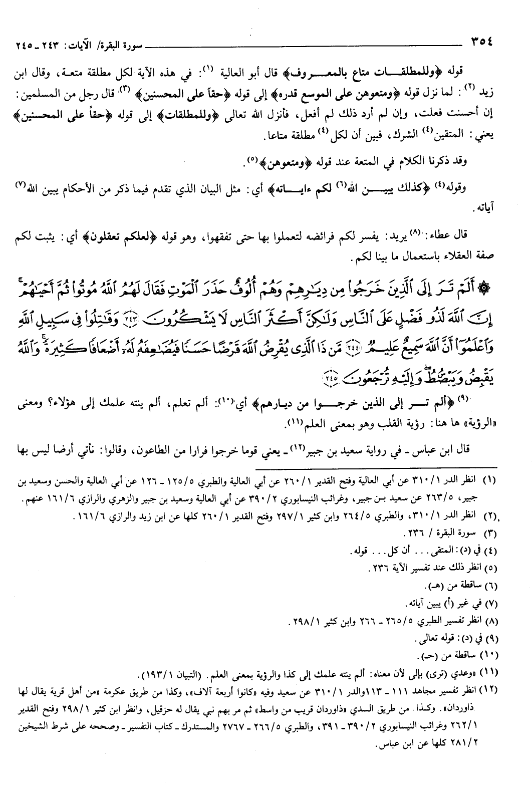 {أَلَمْ تَرَ إِلَى الَّذِينَ خَرَجُوا مِنْ دِيَارِهِمْ وَهُمْ أُلُوفٌ حَذَرَ الْمَوْتِ فَقَالَ لَهُمُ اللَّهُ مُوتُوا ثُمَّ أَحْيَاهُمْ إِنَّ اللَّهَ لَذُو فَضْلٍ عَلَى النَّاسِ وَلَكِنَّ أَكْثَرَ النَّاسِ لا يَشْكُرُونَ {243} وَقَاتِلُوا فِي سَبِيلِ اللَّهِ وَاعْلَمُوا أَنَّ اللَّهَ سَمِيعٌ عَلِيمٌ {244} مَنْ ذَا الَّذِي يُقْرِضُ اللَّهَ قَرْضًا حَسَنًا فَيُضَاعِفَهُ لَهُ أَضْعَافًا كَثِيرَةً وَاللَّهُ يَقْبِضُ وَيَبْسُطُ وَإِلَيْهِ تُرْجَعُونَ {245} } [البقرة: 243-245] {أَلَمْ تَرَ إِلَى الَّذِينَ خَرَجُوا مِنْ دِيَارِهِمْ} [البقرة: 243] أي: ألم تعلم؟ ألم ينته علمك إلى هؤلاء؟ ومعنى الرؤية ههنا: رؤية القلب، وهو بمعنى العلم.