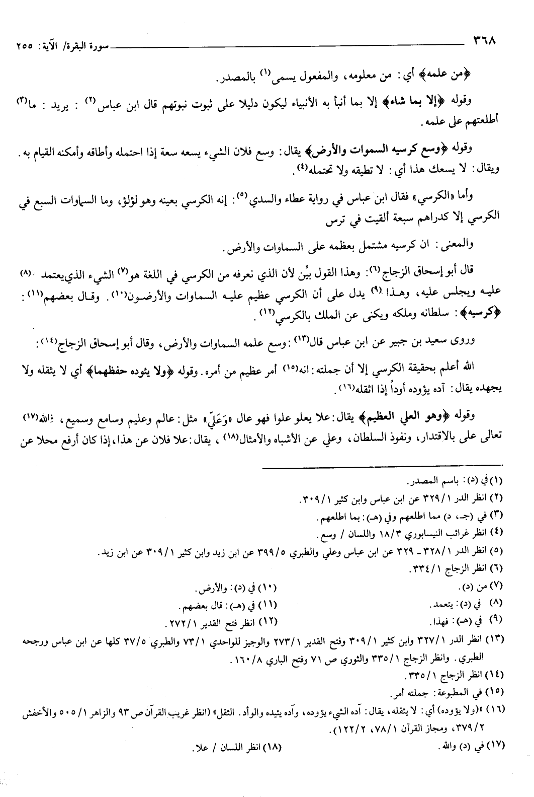 قال أبو إسحاق الزجاج: وهذا القول بين، لأن الذي نعرفه من الكرسي في اللغة هو الشيء الذي يعتمد عليه ويجلس عليه، وهذا يدل على أن الكرسي عظيم، عليه السموات والأرضون.