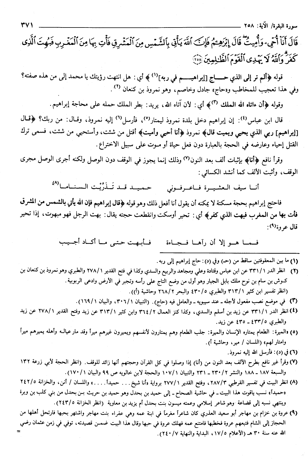 قَالَ أَنَا أُحْيِي وَأُمِيتُ قَالَ إِبْرَاهِيمُ فَإِنَّ اللَّهَ يَأْتِي بِالشَّمْسِ مِنَ الْمَشْرِقِ فَأْتِ بِهَا مِنَ الْمَغْرِبِ فَبُهِتَ الَّذِي كَفَرَ وَاللَّهُ لا يَهْدِي الْقَوْمَ الظَّالِمِينَ} [البقرة: 258] قوله: {أَلَمْ تَرَ إِلَى الَّذِي حَاجَّ إِبْرَاهِيمَ فِي رَبِّهِ} [البقرة: 258] أي: هل انتهت رؤيتك يا محمد إلى من هذه صفته؟ وفي هذا تعجيب للمخاطب، وحاج: جادل وخاصم، وهو نمروذ بن كنعان.