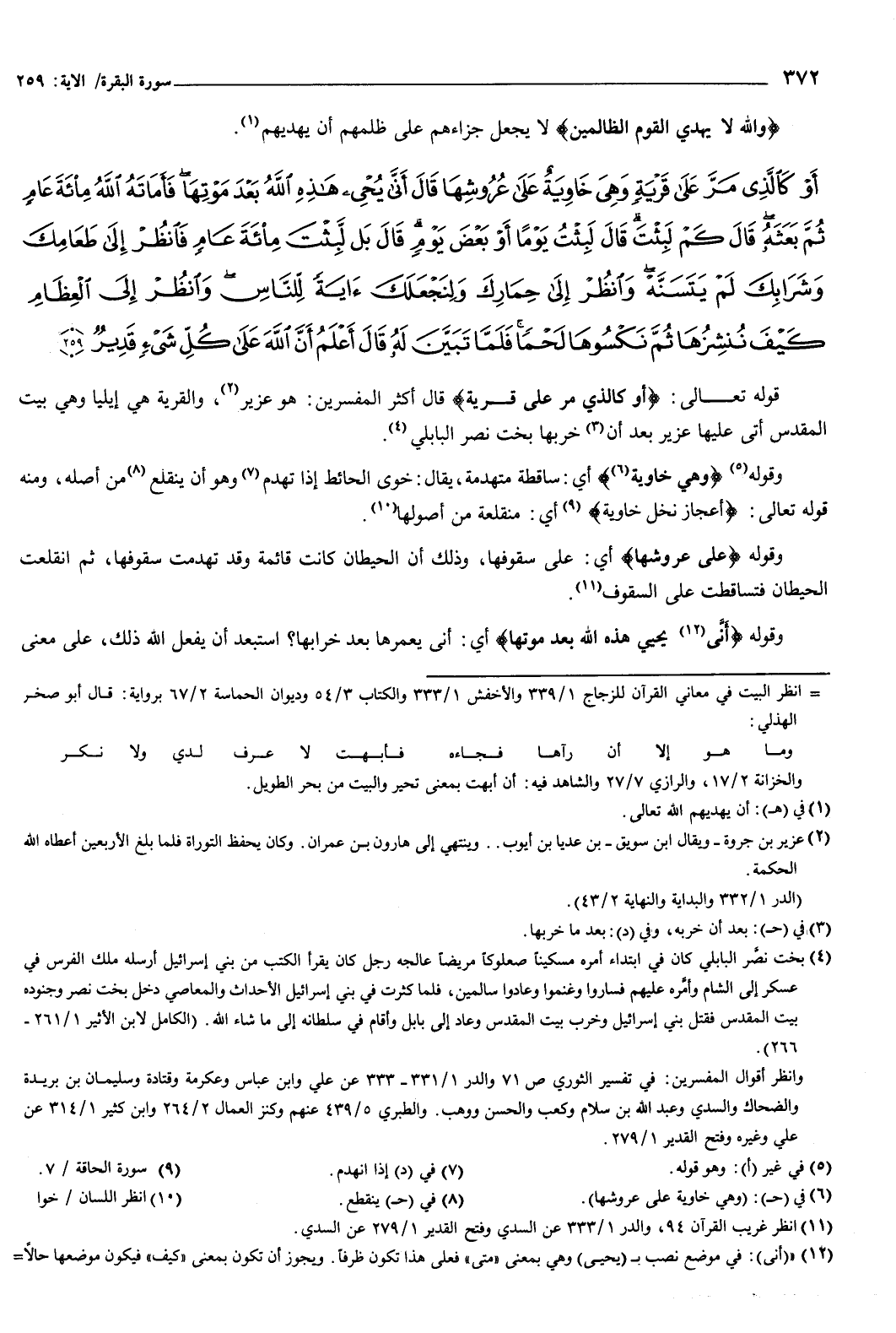 {أَوْ كَالَّذِي مَرَّ عَلَى قَرْيَةٍ وَهِيَ خَاوِيَةٌ عَلَى عُرُوشِهَا قَالَ أَنَّى يُحْيِي هَذِهِ اللَّهُ بَعْدَ مَوْتِهَا فَأَمَاتَهُ اللَّهُ مِائَةَ عَامٍ ثُمَّ بَعَثَهُ قَالَ كَمْ لَبِثْتَ قَالَ لَبِثْتُ يَوْمًا أَوْ بَعْضَ يَوْمٍ قَالَ بَلْ لَبِثْتَ مِائَةَ عَامٍ فَانْظُرْ إِلَى طَعَامِكَ وَشَرَابِكَ لَمْ يَتَسَنَّهْ وَانْظُرْ إِلَى حِمَارِكَ وَلِنَجْعَلَكَ آيَةً لِلنَّاسِ وَانْظُرْ إِلَى الْعِظَامِ كَيْفَ نُنْشِزُهَا ثُمَّ نَكْسُوهَا لَحْمًا فَلَمَّا تَبَيَّنَ لَهُ قَالَ أَعْلَمُ أَنَّ اللَّهَ عَلَى كُلِّ شَيْءٍ قَدِيرٌ} [البقرة: 259] قوله تعالى: {أَوْ كَالَّذِي مَرَّ عَلَى قَرْيَةٍ} [البقرة: 259] قال أكثر المفسرين: هو عزير، والقرية هي إيليا، وهي بيت المقدس، أتى عليها عزير بعد أن خربها بخت نصر البابلي.