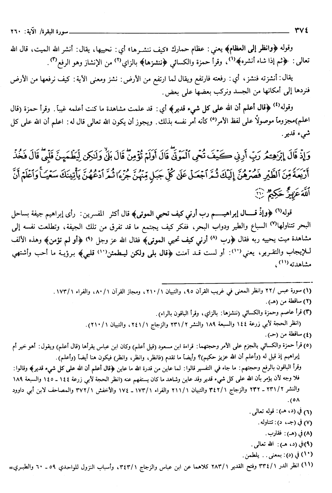 {وَإِذْ قَالَ إِبْرَاهِيمُ رَبِّ أَرِنِي كَيْفَ تُحْيِي الْمَوْتَى قَالَ أَوَلَمْ تُؤْمِنْ قَالَ بَلَى وَلَكِنْ لِيَطْمَئِنَّ قَلْبِي قَالَ فَخُذْ أَرْبَعَةً مِنَ الطَّيْرِ فَصُرْهُنَّ إِلَيْكَ ثُمَّ اجْعَلْ عَلَى كُلِّ جَبَلٍ مِنْهُنَّ جُزْءًا ثُمَّ ادْعُهُنَّ يَأْتِينَكَ سَعْيًا وَاعْلَمْ أَنَّ اللَّهَ عَزِيزٌ حَكِيمٌ} [البقرة: 260] قوله: {وَإِذْ قَالَ إِبْرَاهِيمُ رَبِّ أَرِنِي كَيْفَ تُحْيِي الْمَوْتَى} [البقرة: 260] قال أكثر المفسرين: رأى إبراهيم جيفة بساحل البحر تتناولها السباع والطير ودواب البحر، ففكر كيف يجتمع ما قد تفرق من تلك الجيفة، وتطلعت نفسه إلى مشاهدة ميت يحييه ربه، فقال: {رَبِّ أَرِنِي كَيْفَ تُحْيِي الْمَوْتَى} [البقرة: 260] فقال الله عز وجل: أولم تؤمن وهذه الألف للإيجاب والتقرير، يعني: أولست قد آمنت؟ {قَالَ بَلَى وَلَكِنْ لِيَطْمَئِنَّ قَلْبِي} [البقرة: 260] برؤية ما أحب وأشتهي مشاهدته،