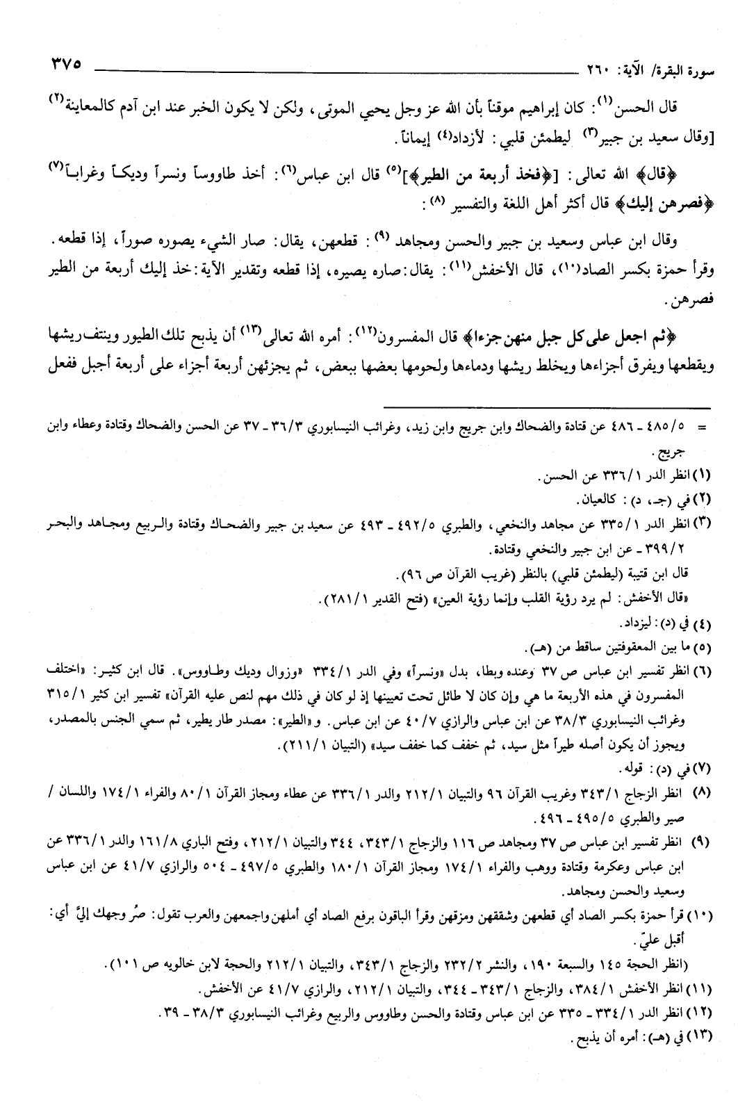 {ثُمَّ اجْعَلْ عَلَى كُلِّ جَبَلٍ مِنْهُنَّ جُزْءًا} [البقرة: 260] قال المفسرون: أمره الله تعالى أن يذبح تلك الطيور وينتف ريشها ويقطعها ويفرق أجزاءها ويخلط ريشها ودماءها ولحومها بعضها ببعض، ثم يجزئهن أربعة أجزاء على أربعة أجبل، ففعل