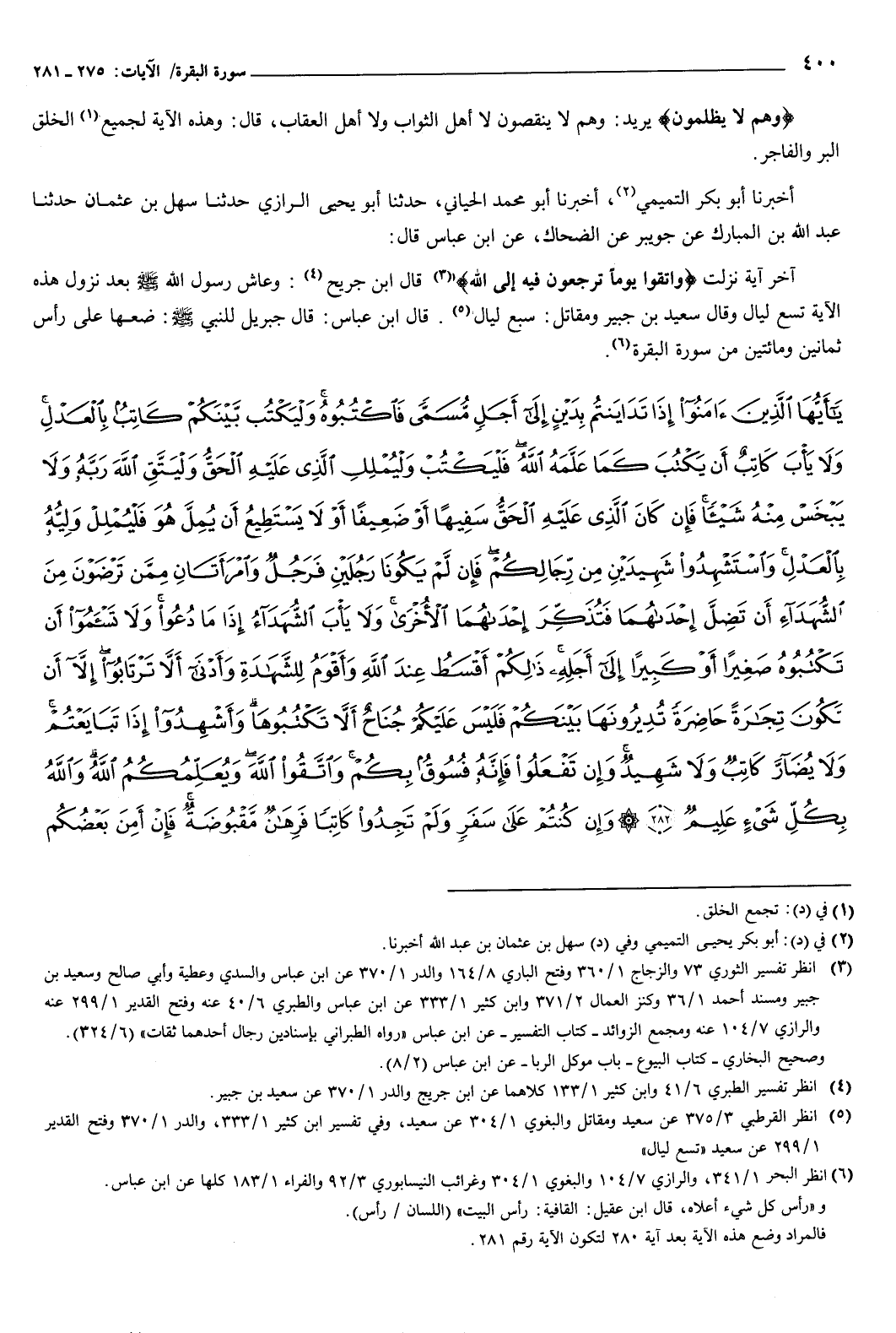 ] يَأَيُّهَا الَّذِينَ آمَنُوا إِذَا تَدَايَنْتُمْ بِدَيْنٍ إِلَى أَجَلٍ مُسَمًّى فَاكْتُبُوهُ وَلْيَكْتُبْ بَيْنَكُمْ كَاتِبٌ بِالْعَدْلِ وَلا يَأْبَ كَاتِبٌ أَنْ يَكْتُبَ كَمَا عَلَّمَهُ اللَّهُ فَلْيَكْتُبْ وَلْيُمْلِلِ الَّذِي عَلَيْهِ الْحَقُّ وَلْيَتَّقِ اللَّهَ رَبَّهُ وَلا يَبْخَسْ مِنْهُ شَيْئًا فَإِنْ كَانَ الَّذِي عَلَيْهِ الْحَقُّ سَفِيهًا أَوْ ضَعِيفًا أَوْ لا يَسْتَطِيعُ أَنْ يُمِلَّ هُوَ فَلْيُمْلِلْ وَلِيُّهُ بِالْعَدْلِ وَاسْتَشْهِدُوا شَهِيدَيْنِ مِنْ رِجَالِكُمْ فَإِنْ لَمْ يَكُونَا رَجُلَيْنِ فَرَجُلٌ وَامْرَأَتَانِ مِمَّنْ تَرْضَوْنَ مِنَ الشُّهَدَاءِ أَنْ تَضِلَّ إِحْدَاهُمَا فَتُذَكِّرَ إِحْدَاهُمَا الأُخْرَى وَلا يَأْبَ الشُّهَدَاءُ إِذَا مَا دُعُوا وَلا تَسْأَمُوا أَنْ تَكْتُبُوهُ صَغِيرًا أَوْ كَبِيرًا إِلَى أَجَلِهِ ذَلِكُمْ أَقْسَطُ عِنْدَ اللَّهِ وَأَقْوَمُ لِلشَّهَادَةِ وَأَدْنَى أَلَّا تَرْتَابُوا إِلا أَنْ تَكُونَ تِجَارَةً حَاضِرَةً تُدِيرُونَهَا بَيْنَكُمْ فَلَيْسَ عَلَيْكُمْ جُنَاحٌ أَلَّا تَكْتُبُوهَا وَأَشْهِدُوا إِذَا تَبَايَعْتُمْ وَلا يُضَارَّ كَاتِبٌ وَلا شَهِيدٌ وَإِنْ تَفْعَلُوا فَإِنَّهُ فُسُوقٌ بِكُمْ وَاتَّقُوا اللَّهَ وَيُعَلِّمُكُمُ اللَّهُ وَاللَّهُ بِكُلِّ شَيْءٍ عَلِيمٌ {282} وَإِنْ كُنْتُمْ عَلَى سَفَرٍ وَلَمْ تَجِدُوا كَاتِبًا فَرِهَانٌ مَقْبُوضَةٌ فَإِنْ أَمِنَ بَعْضُكُمْ