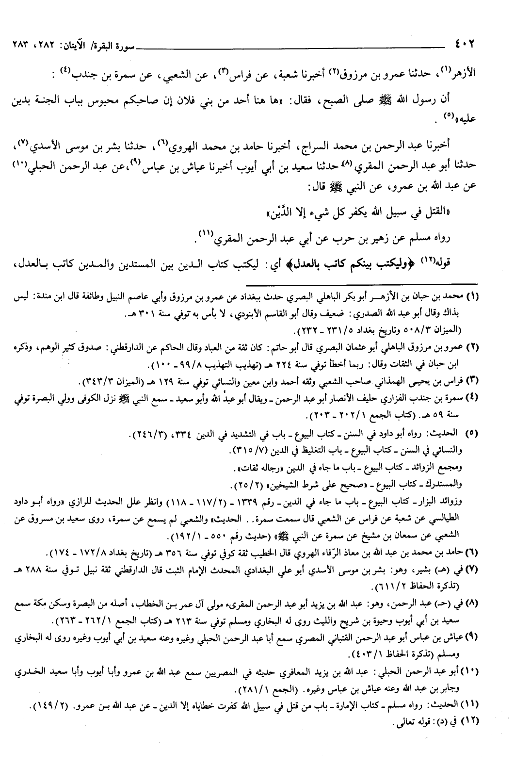 قوله: {وَلْيَكْتُبْ بَيْنَكُمْ كَاتِبٌ بِالْعَدْلِ} [البقرة: 282] أي: ليكتب كتاب الدين بين المستدين والمدين كاتب بالعدل،