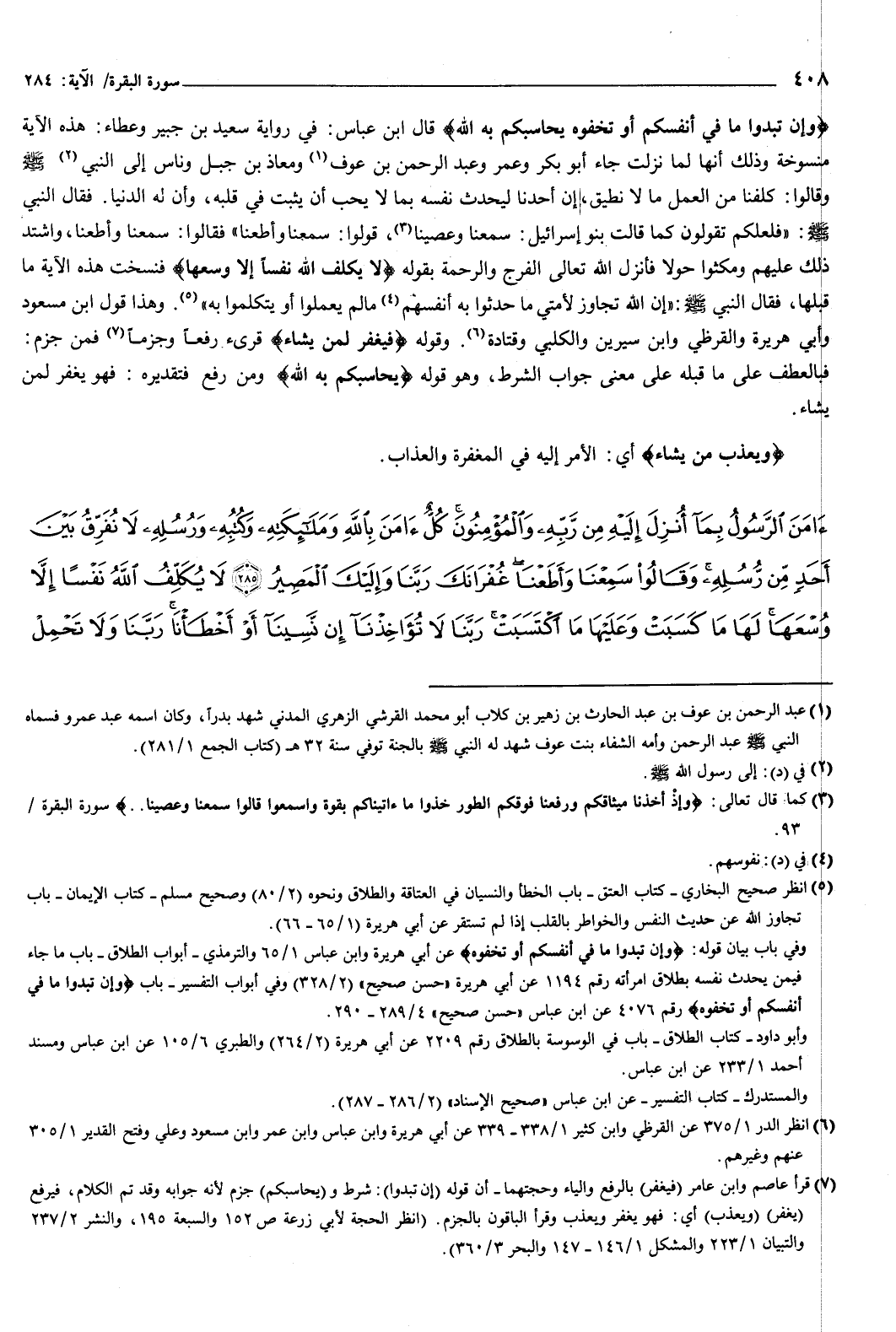 وَإِنْ تُبْدُوا مَا فِي أَنْفُسِكُمْ أَوْ تُخْفُوهُ يُحَاسِبْكُمْ بِهِ اللَّهُ} [البقرة: 284] قال ابن عباس، في رواية سعيد بن جبير وعطاء: هذه الآية منسوخة، وذلك أنها لما نزلت جاء أبو بكر وعمر وعبد الرحمن بن عوف ومعاذ بن جبل وناس إلى النبي صَلَّى اللهُ عَلَيْهِ وَسَلَّمَ وقالوا: كلفنا من العمل ما لا نطيق، إن أحدنا ليحدث نفسه بما لا يحب أن يثبت في قلبه، وأن له الدنيا.