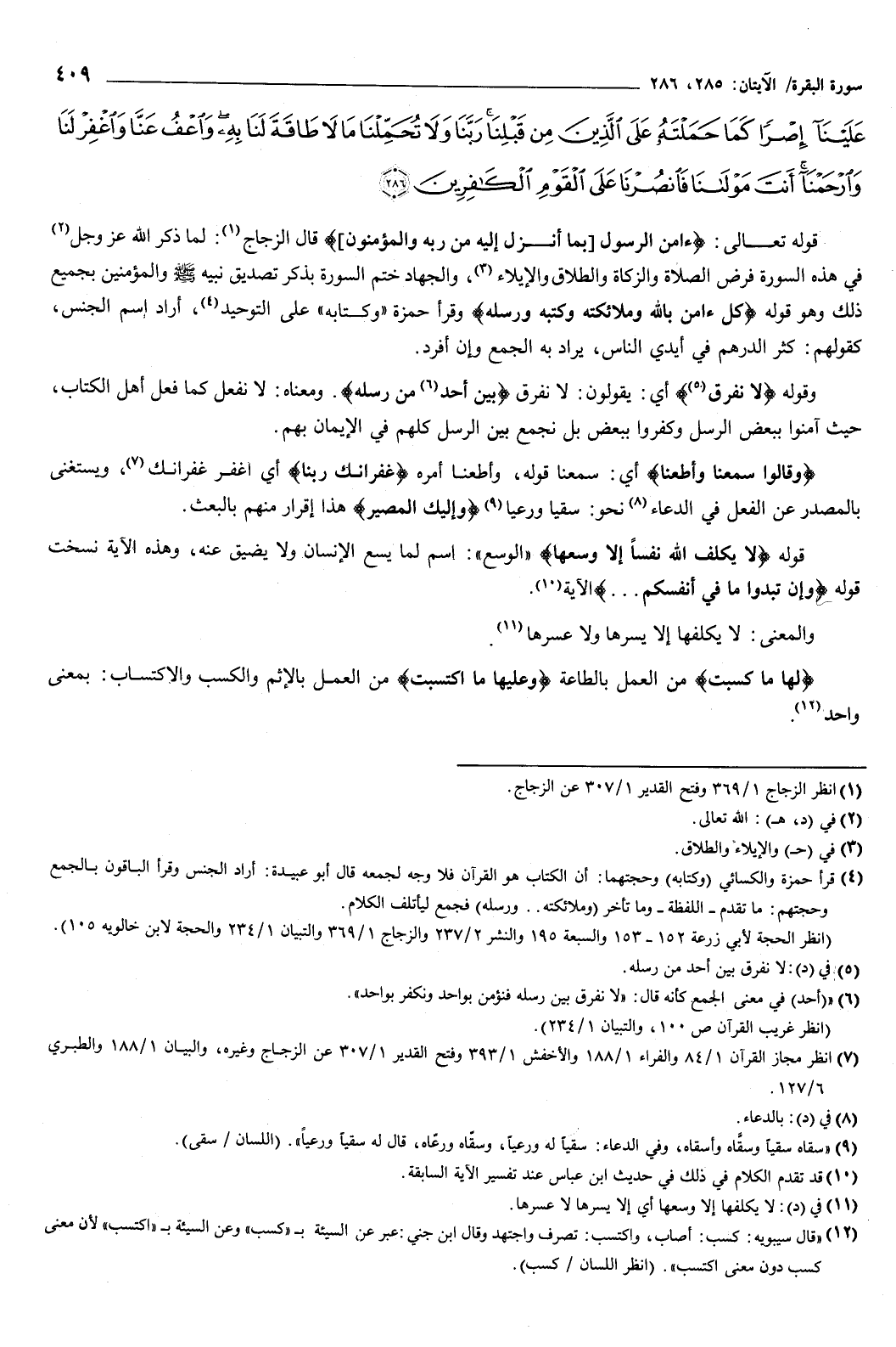 عَلَيْنَا إِصْرًا كَمَا حَمَلْتَهُ عَلَى الَّذِينَ مِنْ قَبْلِنَا رَبَّنَا وَلا تُحَمِّلْنَا مَا لا طَاقَةَ لَنَا بِهِ وَاعْفُ عَنَّا وَاغْفِرْ لَنَا وَارْحَمْنَا أَنْتَ مَوْلانَا فَانْصُرْنَا عَلَى الْقَوْمِ الْكَافِرِينَ {286} } [البقرة: 285-286] قوله تعالى: {آمَنَ الرَّسُولُ بِمَا أُنْزِلَ إِلَيْهِ مِنْ رَبِّهِ وَالْمُؤْمِنُونَ} [البقرة: 285] قال الزجاج: لما ذكر الله عز وجل في هذه ال { [فرض الصلاة والزكاة والطلاق والإيلاء والجهاد، ختم السورة بذكر تصديق نبيه صَلَّى اللهُ عَلَيْهِ وَسَلَّمَ والمؤمنين بجميع ذلك، وهو قوله:] كُلٌّ آمَنَ بِاللَّهِ وَمَلائِكَتِهِ وَكُتُبِهِ وَرُسُلِهِ} [سورة البقرة: 285] وقرأ حمزة وكتابه على التوحيد، أراد اسم الجنس، كقولهم: كثر الدرهم في أيدي الناس، يراد به الجمع وإن أفرد.