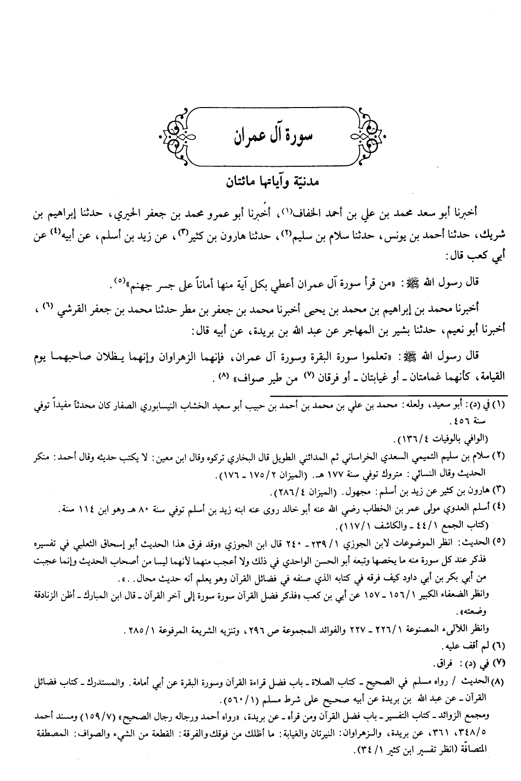 139 - أَخْبَرَنَا أَبُو سَعْدٍ مُحَمَّدُ بْنُ عَلِيِّ بْنِ أَحْمَدَ الْخَفَّافُ، أَخْبَرَنَا أَبُو عَمْرٍو مُحَمَّدُ بْنُ جَعْفَرٍ الْحِيرِيُّ، حَدَّثَنَا إِبْرَاهِيمُ بْنُ شَرِيكٍ، حَدَّثَنَا أَحْمَدُ بْنُ يُونُسَ، حَدَّثَنَا سَلامُ بْنُ سُلَيْمٍ، حَدَّثَنَا هَارُونُ بْنُ كَثِيرٍ، عَنْ زَيْدِ بْنِ أَسْلَمَ، عَنْ أَبِيهِ، عَنْ أُبَيِّ بْنِ كَعْبٍ قَالَ: قَالَ رَسُولُ اللَّهِ صَلَّى اللهُ عَلَيْهِ وَسَلَّمَ: «مَنْ قَرَأَ سُورَةَ آلِ عِمْرَانَ أُعْطِيَ بِكُلِّ آيَةٍ مِنْهَا أَمَانًا عَلَى جِسْرِ جَهَنَّمَ»