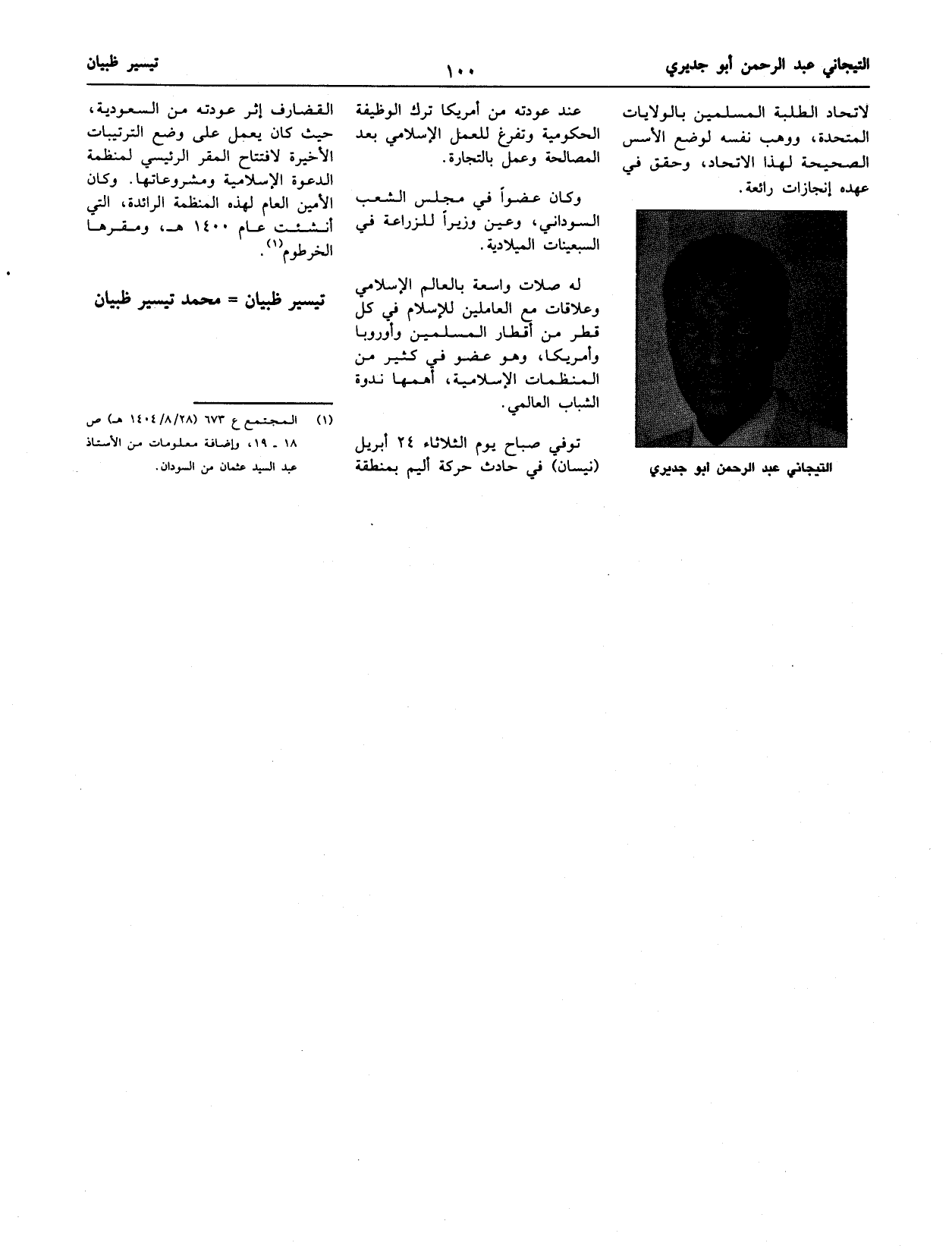 (¬1) المجتمع ع 673 (28/ 8/ 1404 هـ) ص 18 - 19، وإضافة معلومات من الأستاذ عبد السيد عثمان من السودان.
