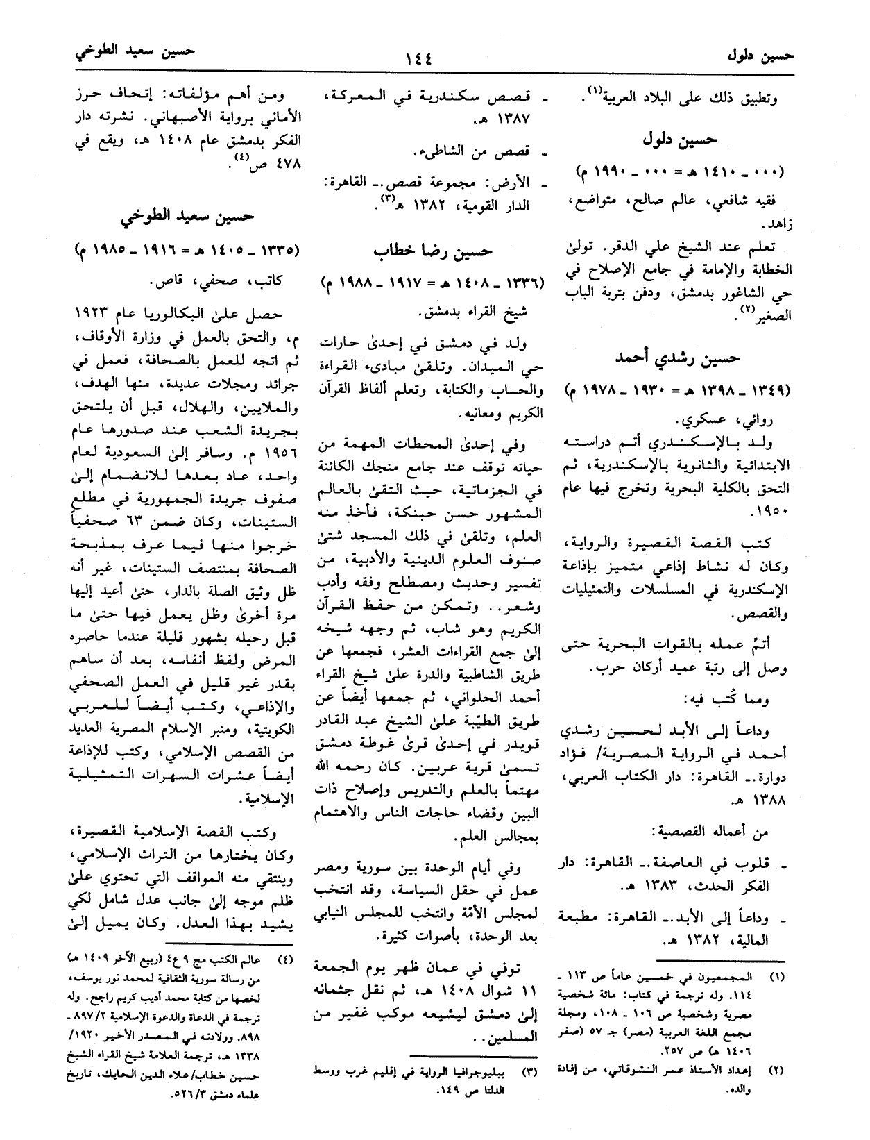 (¬4) عالم الكتب مج 9 ع 4 (ربيع الآخر 1409 هـ) من رسالة سورية الثقافية لمحمد نور يوسف، لخصها من كتابة محمد أديب كريم راجح. وله ترجمة في الدعاة والدعوة الإسلامية 2/ 897 - 898. وولادته في المصدر الأخير 1920/ 1338 هـ، ترجمة العلامة شيخ القراء الشيخ حسين خطاب/ علاء الدين الحايك، تاريخ علماء دمشق 3/ 526.