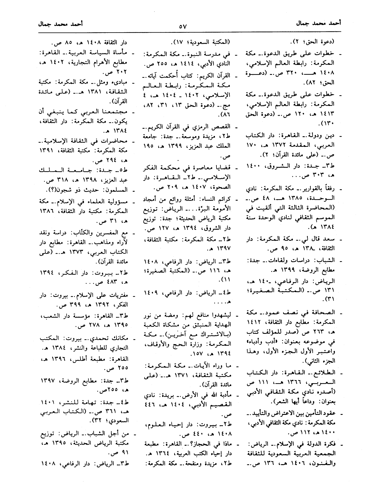 - القرآن الكريم: كتاب أحكمت آياته.- مكة المكرمة: رابطة العالم الإسلامي، 1402 - 1404 هـ، 4 مج.- (دعوة الحق 13، 31، 82، 86).