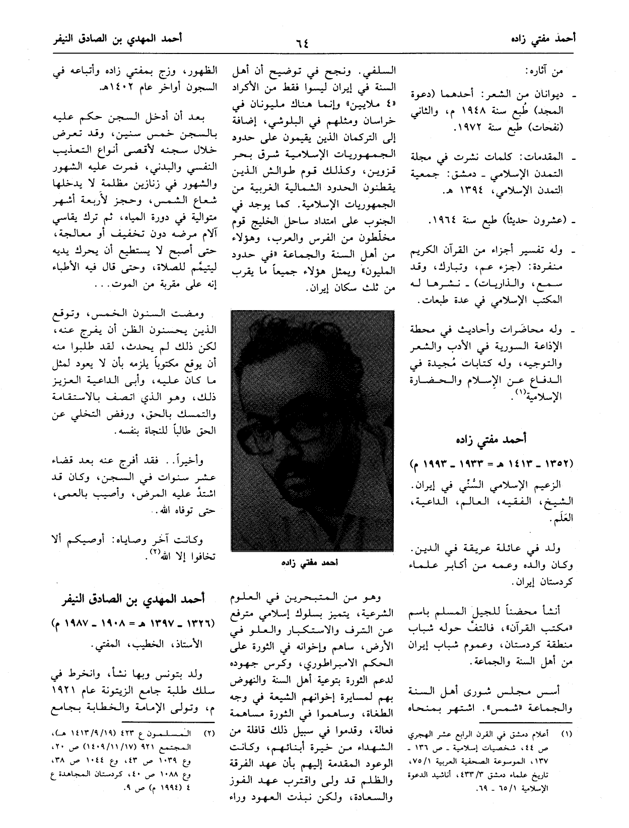 (¬2) المسلمون ع 423 (19/ 9/ 1413 هـ)، المجتمع 921 (17/ 11/ 1409) ص 20، وع 1039 ص 43، وع 1044 ص 38، وع 1088 ص 40، كردستان المجاهدة ع 4 (1994 م) ص 9.