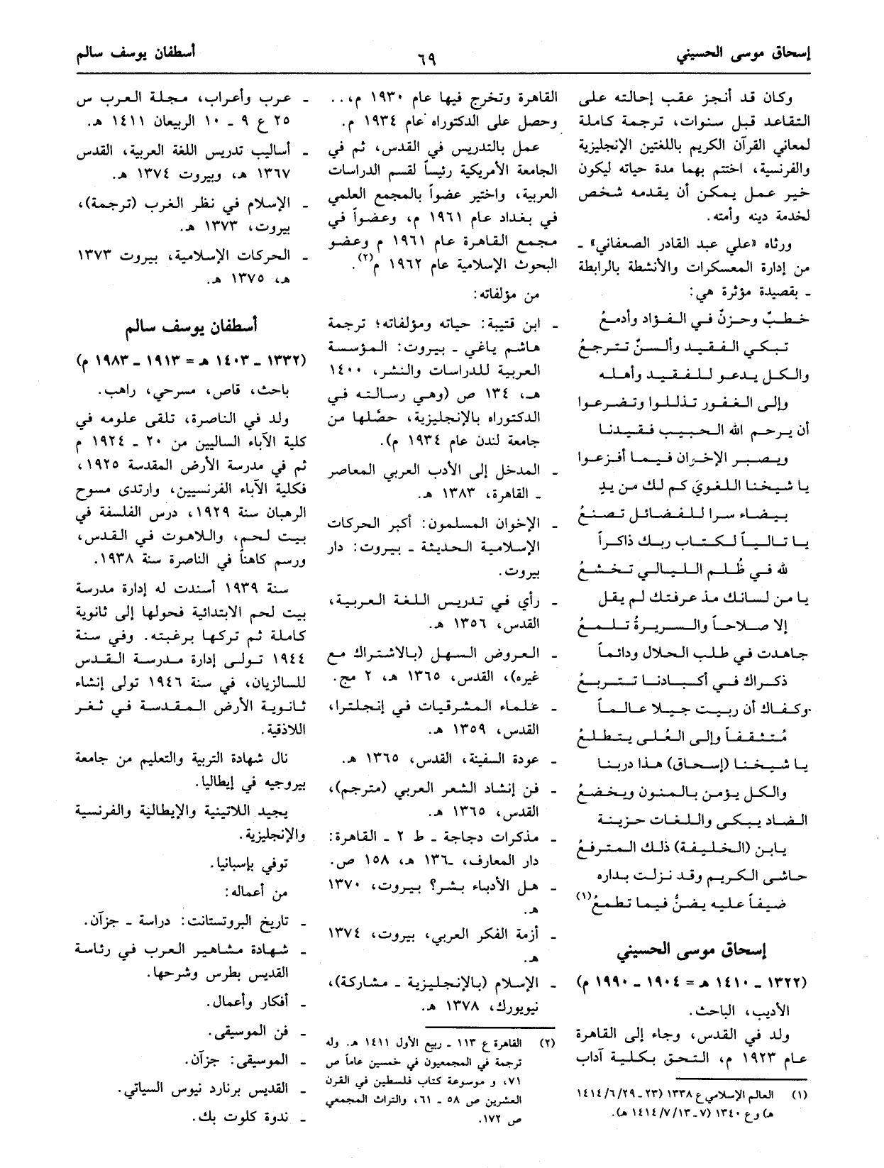 (¬2) القاهرة ع 113 - ربيع الأول 1411 هـ. وله ترجمة في المجمعيون في خمسين عاما ص 71، وموسوعة كتاب فلسطين في القرن العشرين ص 58 - 61، والتراث المجمعي ص 172.