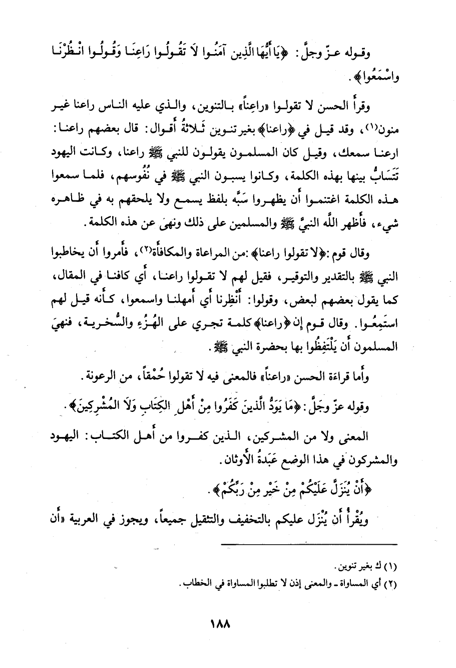 منون، وقد قيل في (راعنا) بغير تنوين ثَلاثةُ أقوال: قال بعضهم راعنا: