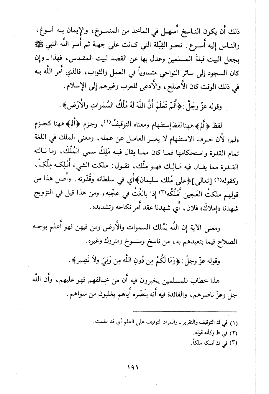وقوله عزَّ وجلَّ: (أَلَمْ تَعْلَمْ أَنَّ اللَّهَ لَهُ مُلْكُ السَّمَاوَاتِ وَالْأَرْضِ وَمَا لَكُمْ مِنْ دُونِ اللَّهِ مِنْ وَلِيٍّ وَلَا نَصِيرٍ (107)