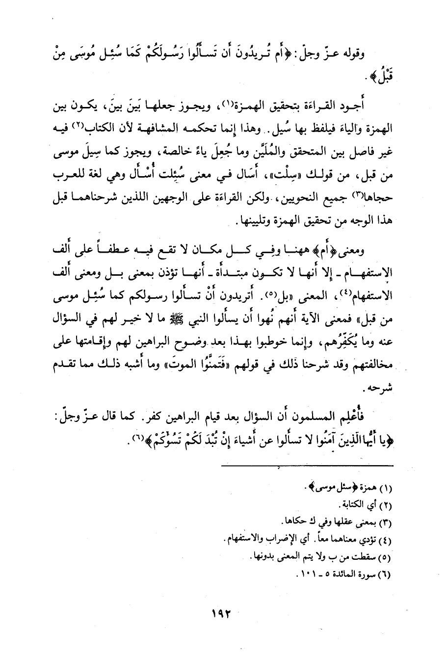 من قبل " فمعنى الآية أنهم نًهوا أن يسألوا النبي - صلى الله عليه وسلم - ما لا خير لهم في السؤال عنه وما يُكَفِّرهم، وإِنما خوطبوا بهذا بعد وضوح البراهين لهم وإقامتها على مخالفتهم وقد شرحنا ذلك في قوله