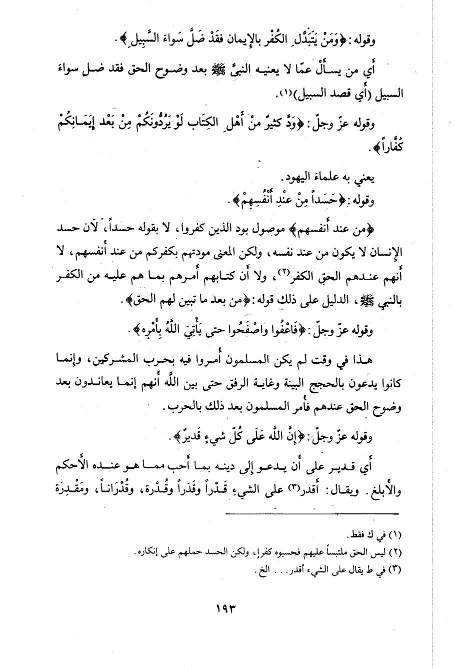 وقوله عزَّ وجلَّ: (وَدَّ كَثِيرٌ مِنْ أَهْلِ الْكِتَابِ لَوْ يَرُدُّونَكُمْ مِنْ بَعْدِ إِيمَانِكُمْ كُفَّارًا حَسَدًا مِنْ عِنْدِ أَنْفُسِهِمْ مِنْ بَعْدِ مَا تَبَيَّنَ لَهُمُ الْحَقُّ فَاعْفُوا وَاصْفَحُوا حَتَّى يَأْتِيَ اللَّهُ بِأَمْرِهِ إِنَّ اللَّهَ عَلَى كُلِّ شَيْءٍ قَدِيرٌ (109)