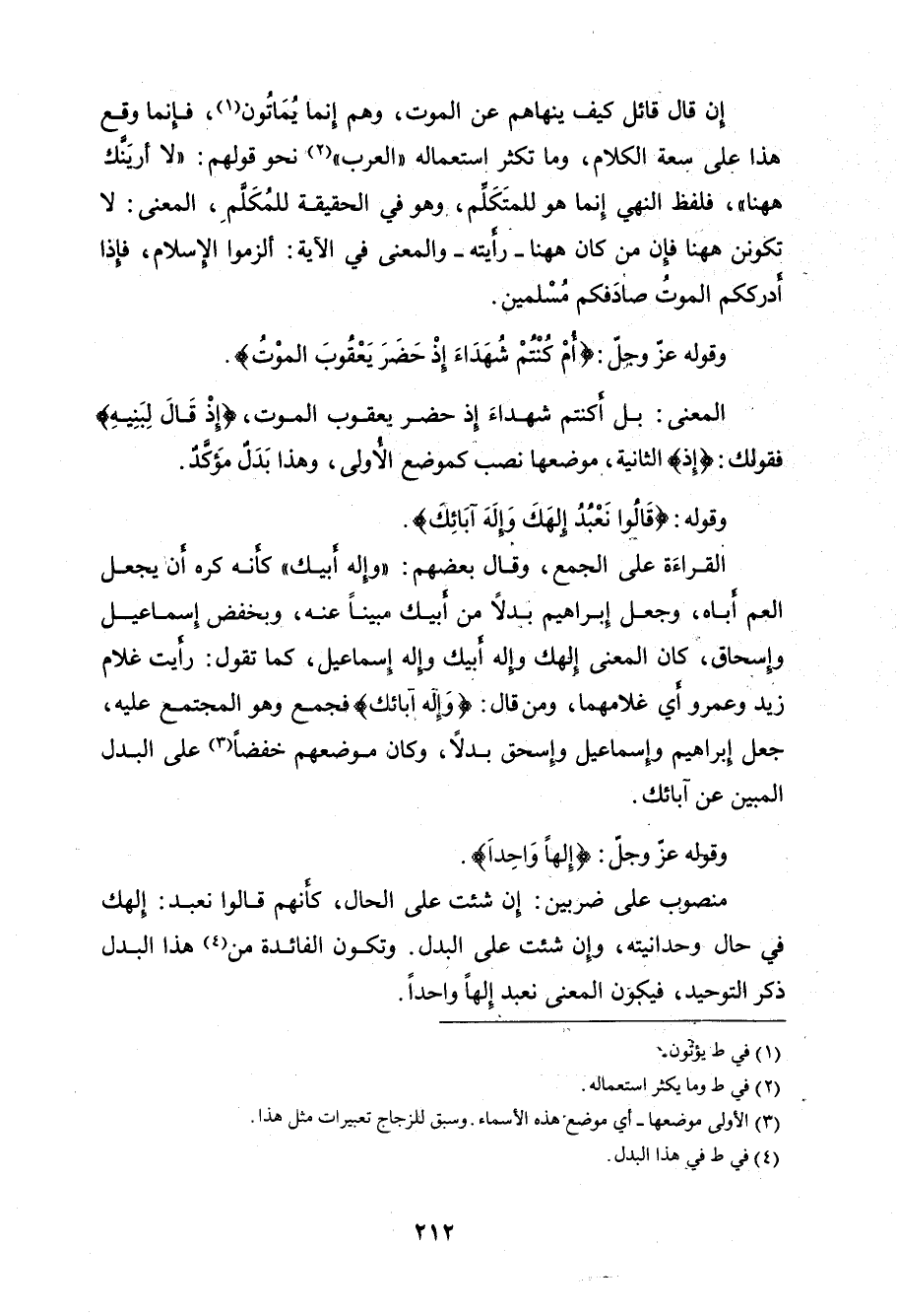 وقوله عزَّ وجلَّ: (أَمْ كُنْتُمْ شُهَدَاءَ إِذْ حَضَرَ يَعْقُوبَ الْمَوْتُ إِذْ قَالَ لِبَنِيهِ مَا تَعْبُدُونَ مِنْ بَعْدِي قَالُوا نَعْبُدُ إِلَهَكَ وَإِلَهَ آبَائِكَ إِبْرَاهِيمَ وَإِسْمَاعِيلَ وَإِسْحَاقَ إِلَهًا وَاحِدًا وَنَحْنُ لَهُ مُسْلِمُونَ (133)