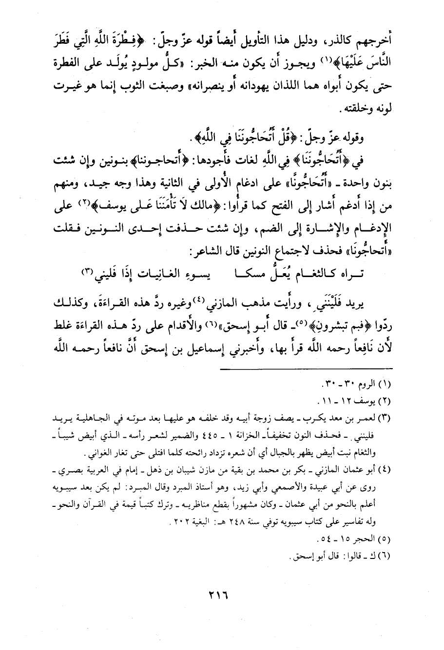 بنون واحدة - " أتُحَاجُونَّا " على إدغام الأولى في الثانية وهذا وجه جيد، ومنهم من إِذا أدغم أشار إِلى الفتح كما قراوا: (مَا لَكَ لَا تَأْمَنَّا عَلَى يُوسُفَ) على الإدغام والِإشارة إِلى الضم، وإِن شئت حذفت إِحدى النونين فقلت