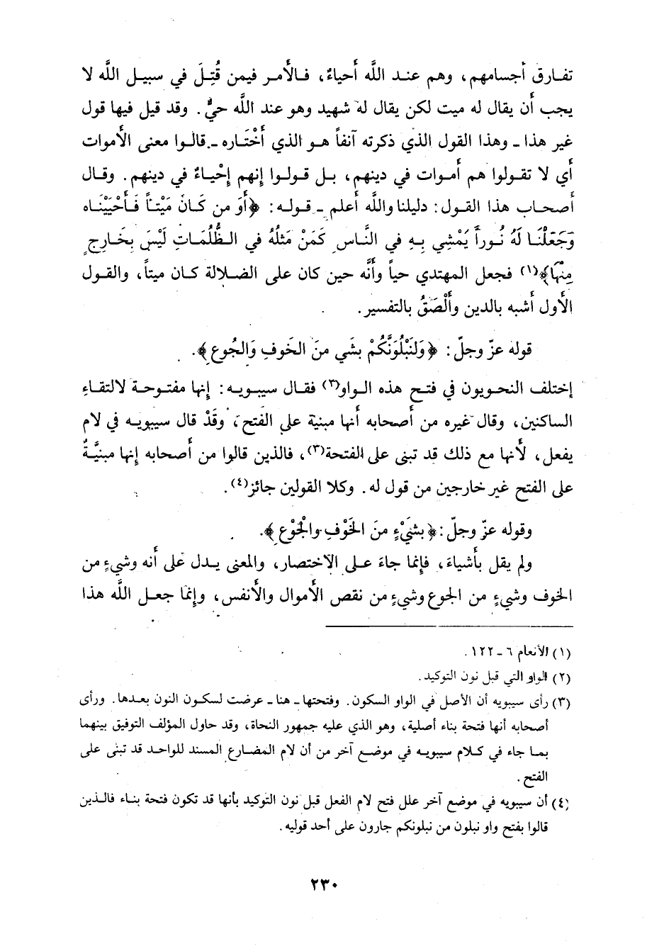 وقال أَصحاب هذا القول: دليلنا والله أعلم - قوله: (أَوَمَنْ كَانَ مَيْتًا فَأَحْيَيْنَاهُ وَجَعَلْنَا لَهُ نُورًا يَمْشِي بِهِ فِي النَّاسِ كَمَنْ مَثَلُهُ فِي الظُّلُمَاتِ لَيْسَ بِخَارِجٍ مِنْهَا) فجعل المهتدي حياً وانَّه حين كان على الضلالة كان ميتاً، والقول الأول أشبه بالدين وألْصقُ بالتفسير.