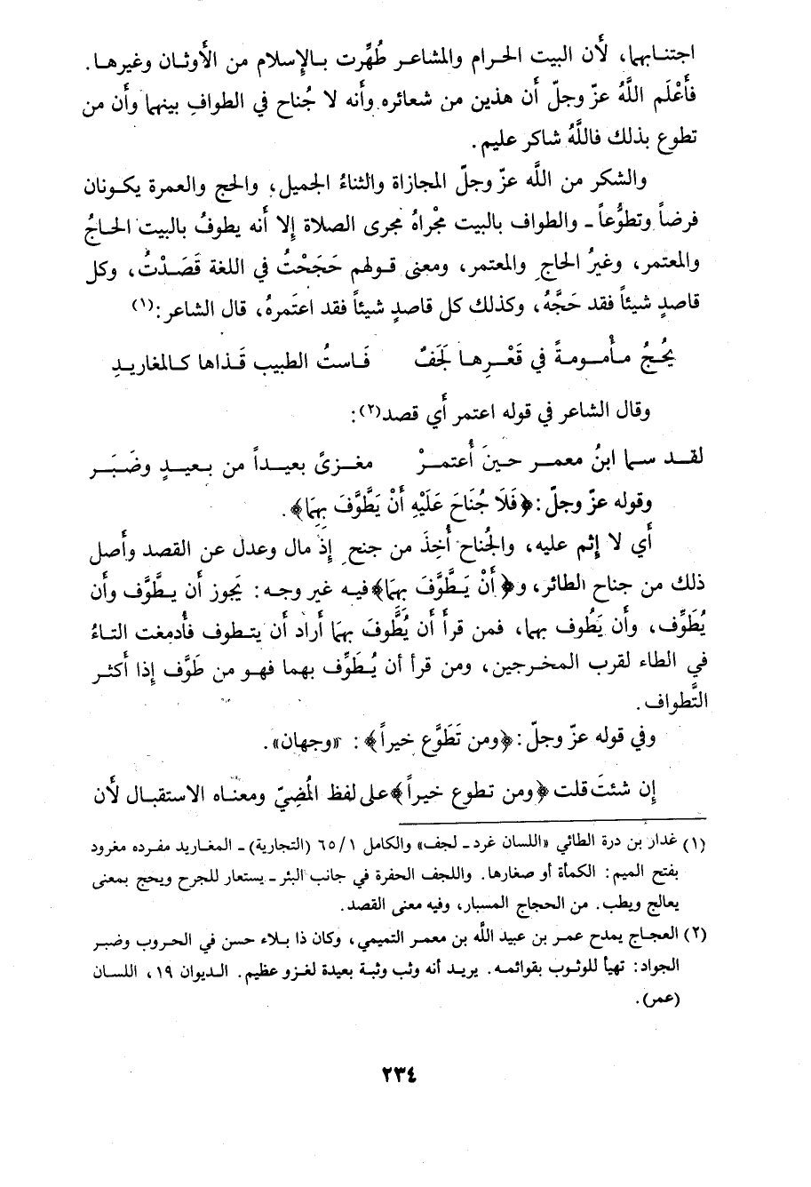 ذلك من جناح الطائر، و (أَنْ يَطَّوَّفَ بِهِمَا) فيه غير وجه: يَجوز أن يطَوَّف وأن يُطَوِّف، وأن يطُوف بهما، فمن قرأ أن يُطَوِّف بهمَا أراد أن يتطوف فأدمِغت التاء في الطاء لقرب المخرجين، ومن قرأ أن يُطَوِّف بهما فهو من طَوَّف إِذا أكثر التَّطواف. . .
