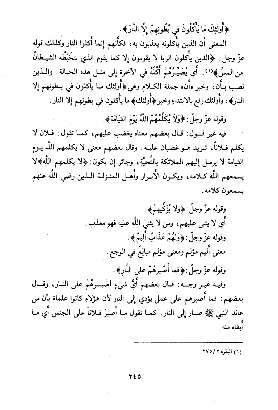 وقال بعضهم معنى (لاَ يُكَلمُهُمْ اللَّهُ يَوْمَ القِيَامَةِ) لا يرسل إليهم الملائكة بالتَحيةِ، وجائز إِن يكون: (لاَ يُكَلمُهُمْ اللَّهُ) لا يسمعهم الله كلامه، ويكون الأبرار وأهل المنزلة الذين رضي اللَّه عنهم يسمعون كلامه.