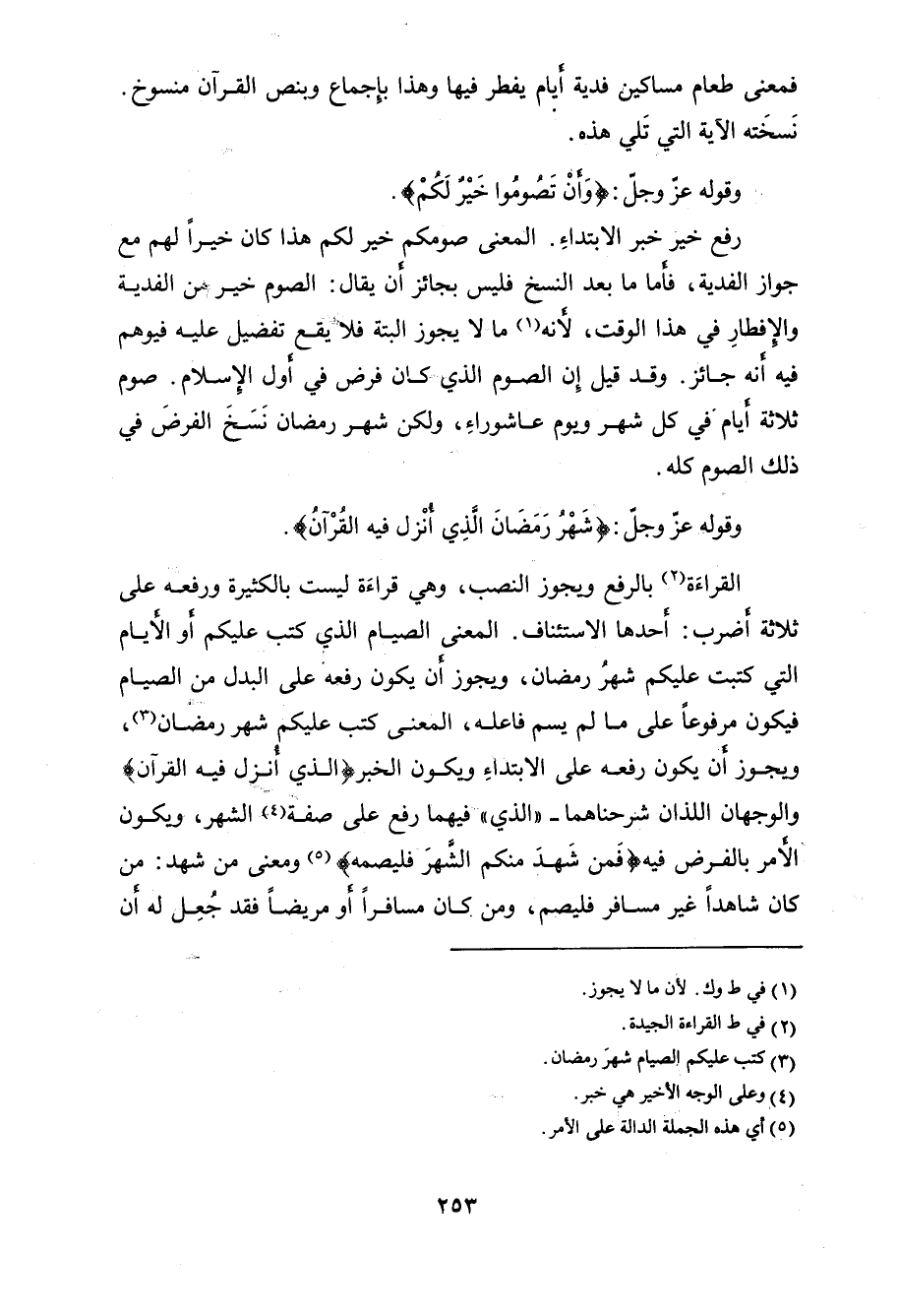 جواز الفدية، فأما ما بعد النسخ فليس بجائز أن يقال: الصوم خير - من الفدية والإفطارِ في هذا الوقت، لأنه ما لا يجوز ألبتَّة فلا يقع تفضيل عليه فيوهم فيه أنه جائز. وقد قيل إِن الصوم الذي كان فرض في أول الإسلام. صوم ثلاثة أيام في كل شهر ويوم عاشوراءِ، ولكن شهر رمضان نَسَخَ الفرضَ في ذلك الصوم كله.