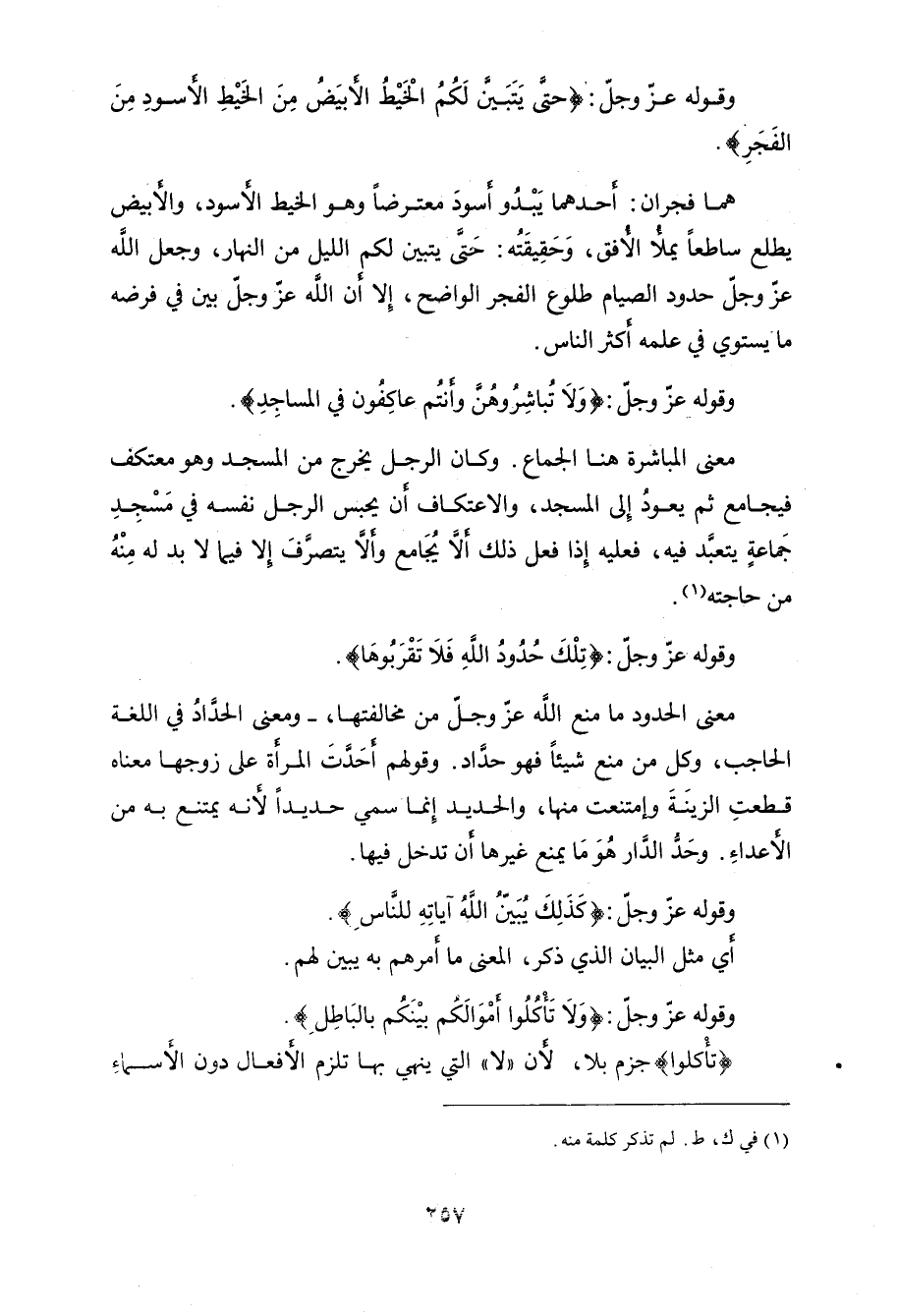 يطلع ساطعاً يملأ الأفق، وَحَقِيقَتُه: حَتَّى يتبين لكم الليل من النهار، وجعل اللَّه عزّ وجلَّ حدود الصيام طلوع الفجر الواضح، إِلا أن اللَّه عزَّ وجلَّ بين في فرضه ما يستوي في علمه أكثر الناس.