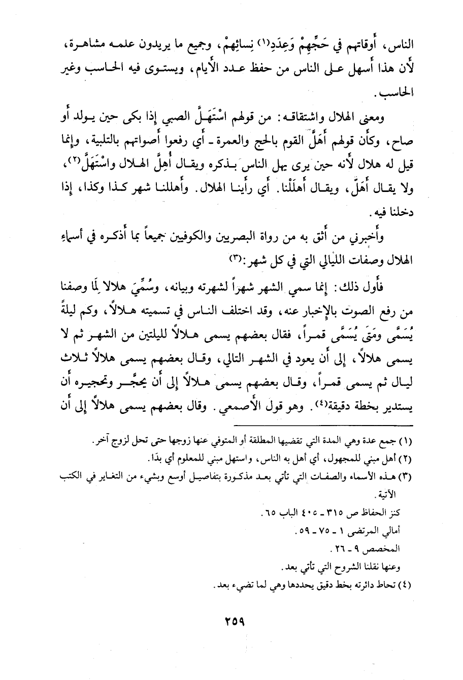 من رفع الصوت بالِإخبار عنه، وقد اختلف الناس في تسميته هلالًا، وكم ليلةً يُسَمَّى ومَتَى يُسَمَّى قمراً، فقال بعضهم يسمى هلالًا لليلتين من الشهر ثم لا يسمى هلالًا، إِلى أن يعود في الشهر التالي، وقال بعضهم يسمى هلالًا ثلاث ليال ثم يسمى قمراً، وقال بعضهم يسمى هلالًا إِلى أن يحجَّر وتحجيره أن يستدير بخطة دقيقة.