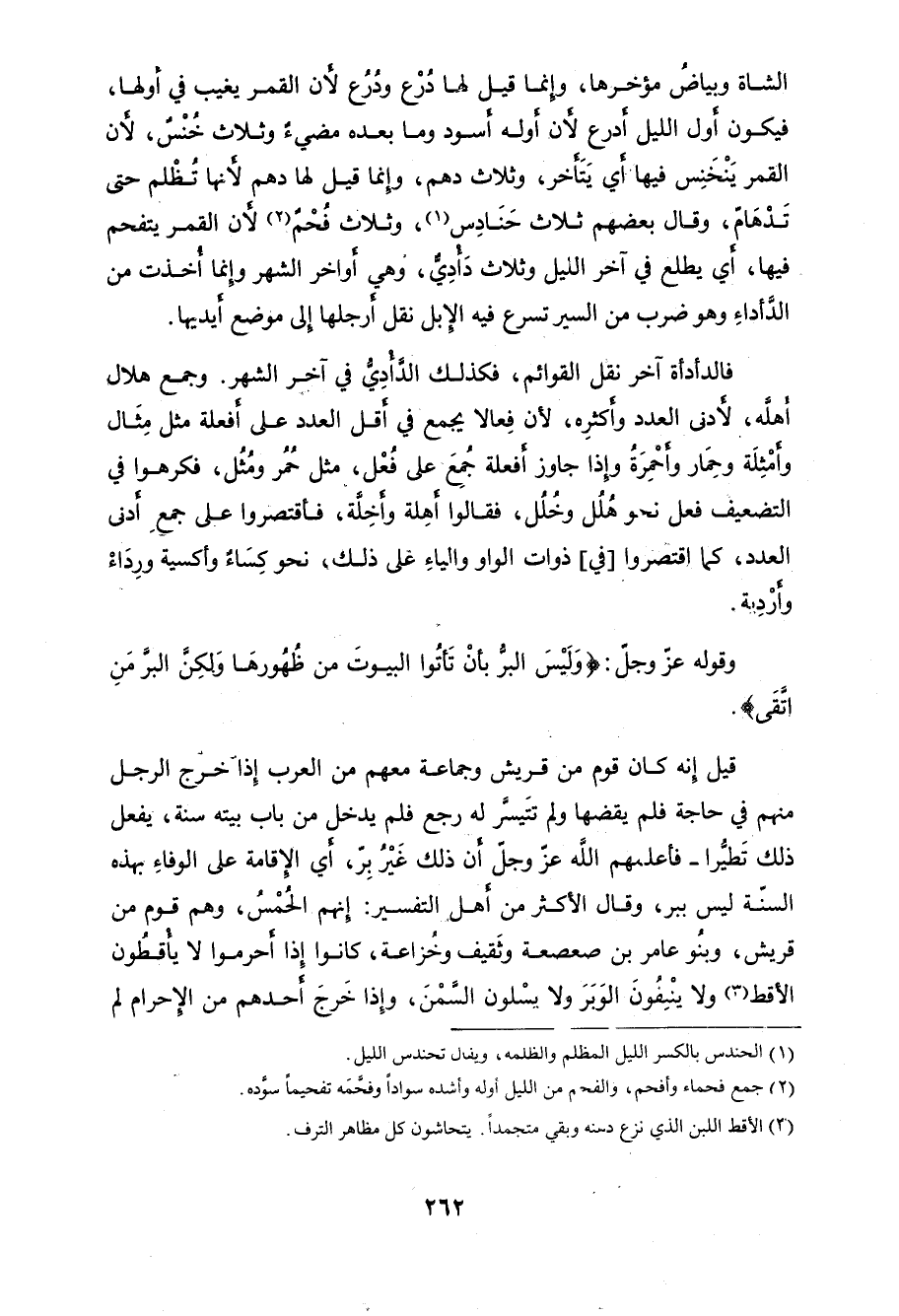 منهم في حاجة فلم يقضها ولم تتَيسر له رجع فلم يدخل من باب بيته سنة، يفعل ذلك تَطيرا - فأعلمهم اللَّه عزَّ وجل أن ذلك غَيْرُ بِر، أي الإقامة على الوفاءِ - بهذه السَّنة ليس ببر، وقال الأكثر من أهل التفسير: إنهم الحُمْسُ، وهم قوم من قريش، وبنُو عامر بن صعصعة وثَقيف وخزاعة، كانوا إِذا أحرموا لا يأقطُون الأقط، ولا ينْفُونَ الوَبَرَ ولا يسْلون السَّمْنَ، وإِذا خَرجَ أحدهم من الإحرام