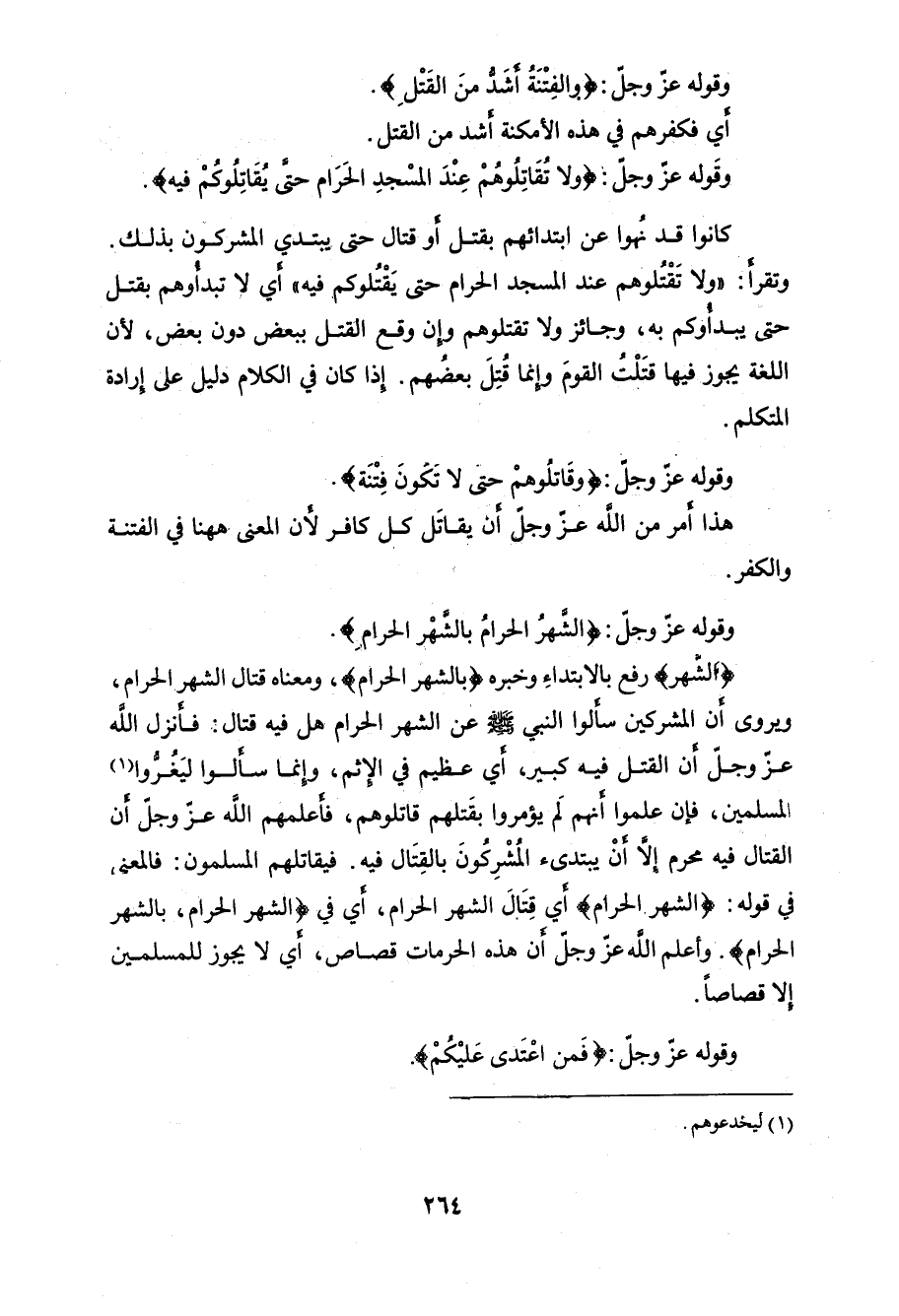 وتقرأ: (ولا تَقْتُلوهم عند المسجد الحرام حتى يَقْتُلوكم فيه) أي لا تبدأوهم بقتل حتى يبدأوكم به، وجائز ولا تقتلوهم وإن وقع القتل ببعض دون بعض، لأن اللغة يجوز فيها قتَلْتُ القومَ وإنَّما قُتِلَ بعضُهم إذا كان في الكلام دليل على إرادة المتكلم.