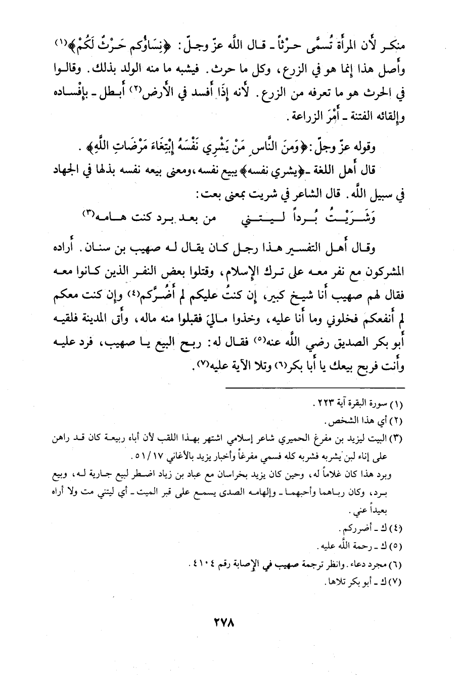 فقال لهم صهيب أنا شيخ كبير، إن كنت عليكم لم أضُركم " وإِن كنت معكم لم أنفعكم فخلوني وما أنا عليه، وخذوا ماليَ فقبلوا منه ماله، وأتى المدينة فلقيه أبو بكر الصديق رضي اللَّه عنه فقال له: ربح البيع يا صهيب، فرد عليه وأنت فربح بيعك يا أبا بكر وتلا الآية عليه.