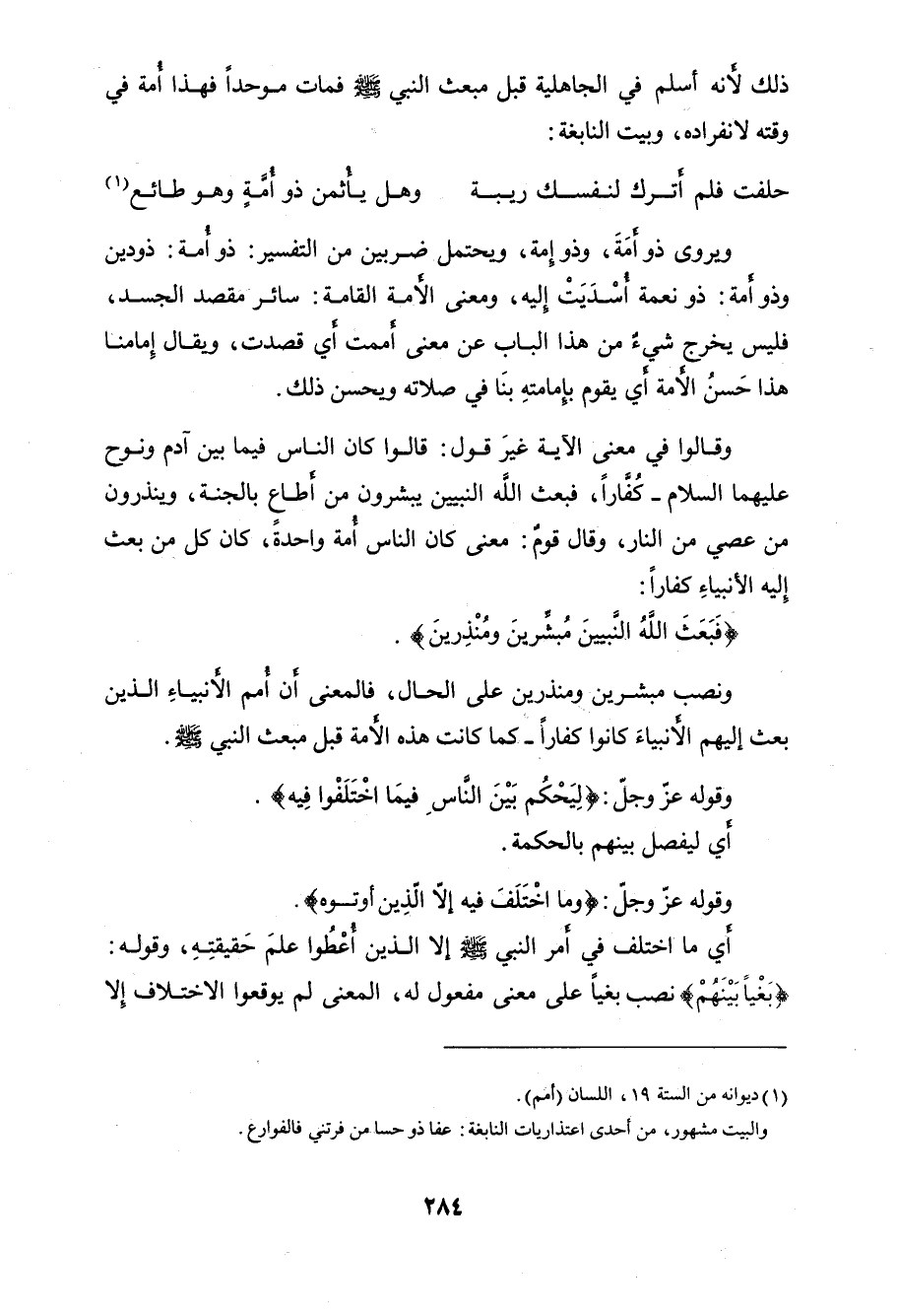 ذلك لأنه أسلم في الجاهلية قبل مبعث النبي - صلى الله عليه وسلم - فمات موحداً فهذا أمة في وقته لانفراده، وبيت النابغة: