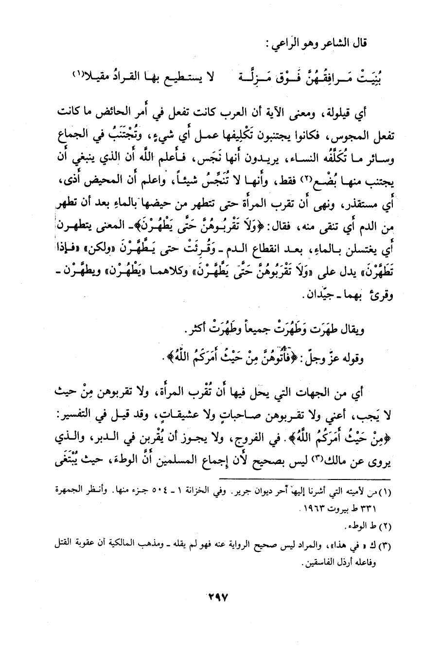 أي مستقذر، ونهى أن تقرب المرأة حتى تتطهر من حيضها - بالماءِ بعد أن تطهر من الدم أي تنقى منه، فقال: (وَلَا تَقْربُوهُن حَتى يَطْهُرْنَ) -