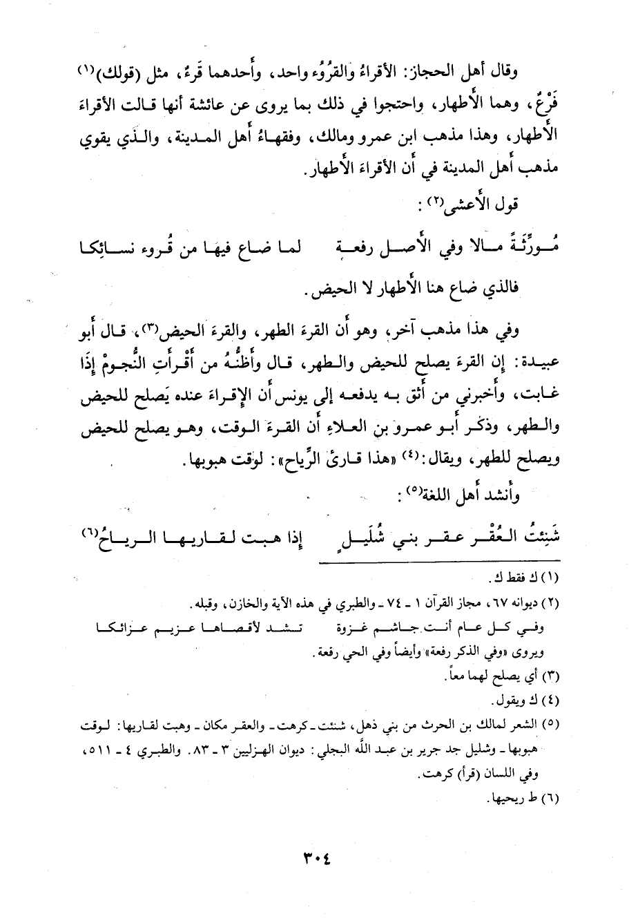 قال أبو عبيدة: إن القرءَ يصلح للحيض والطهر، قال وأظنهُ من أقْرأتِ النُجومْ إِذَا غابت، وأخبرني من أثق به يدفعه إلى يونس أن الِإقراءَ عنده يَصلح للحيض والطهر، وذكر أبو عمرو بن العلاءِ أن القرءَ - الوقت، وهو يصلح للحيض ويصلح للطهر، ويقال: " هذا قارئ الرِّياح ": لوقت هبوبها.