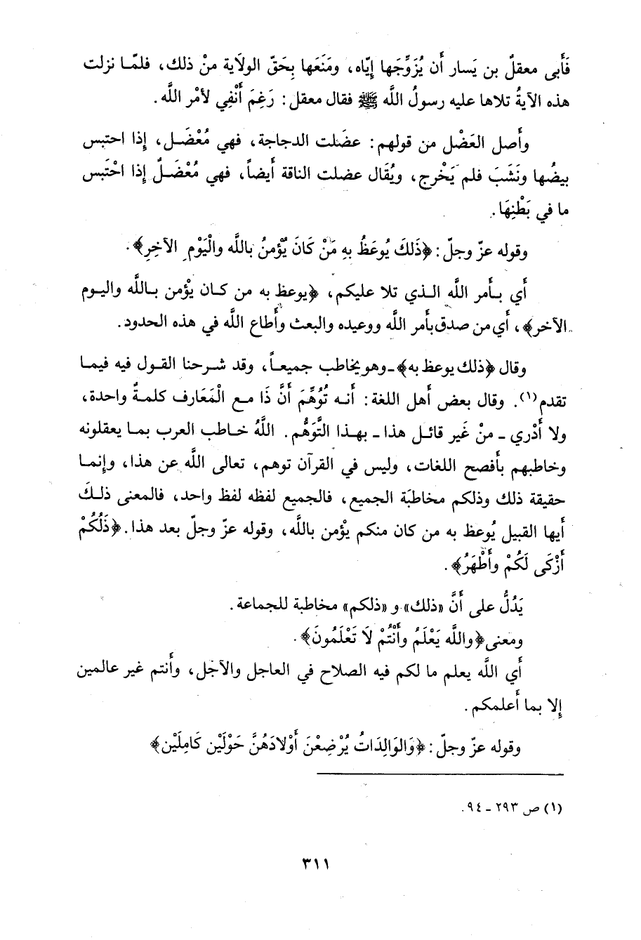 فَأبى معقل بن يَسار أن يزَؤَجَها إيَّاه، ومَنَعَها بِحَقّ الولاَية منْ ذلك، فلما نزلت هذه الآية تلاها عليه رسول الله - صلى الله عليه وسلم - فقال معقل: رَغِمَ أنْفِي لأمْر اللَّه.