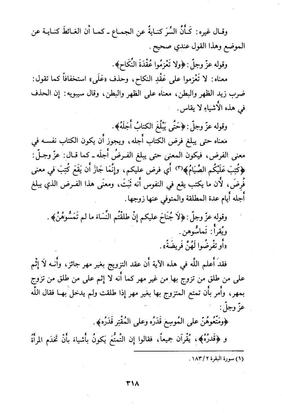 كما قال: عزَّ وجلَّ: (كُتِبَ عَلَيْكُم الصِّيَامُ) أي فرض عليكم، وِإنَّمَا جَازَ أن يَقَعَ (كُتِبَ) في معنى فُرِضَ، لأن ما يكتب يقع في النفوس أنه ثَبَتَ، ومعنَى هذا الفرض الذي يبلغ أجله أيام عدة المطلقة والمتوفي عنها زوجها.