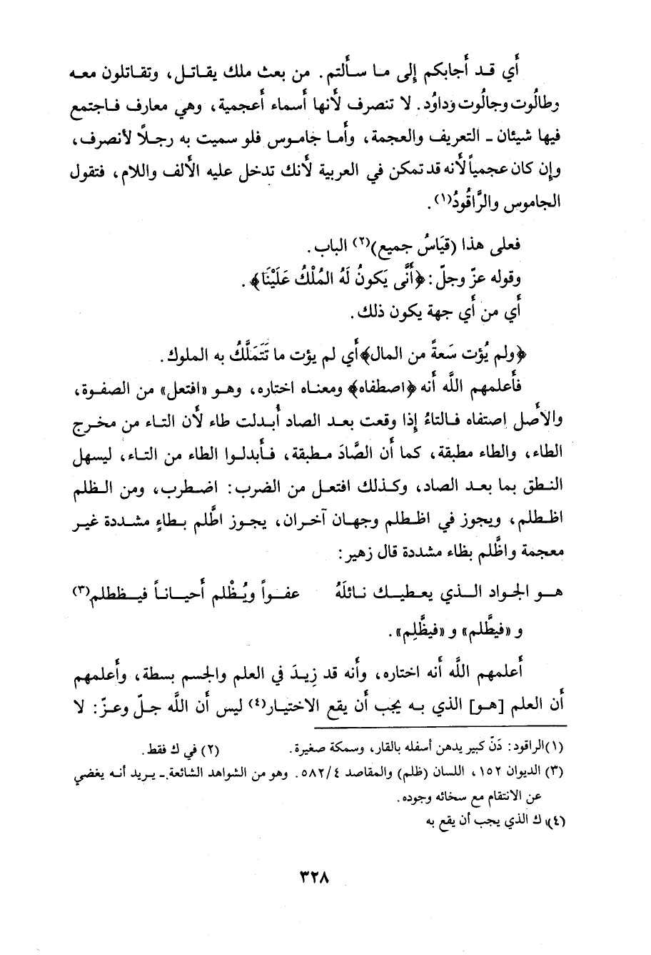 وطالُوت وجالُوت وداوُد. لا تنصرف لأنها أسماء أعجمية، وهي معارف فاجتمع فيها شيئان - التعريف والعجمة، وأما جاموس فلو سميت به رجلًا لانصرف، وإن كان عجمياً لأنه قدتمكن في العربية لأنك تدخل عليه الألف واللام، فتقول الجاموس والراقُودُ.