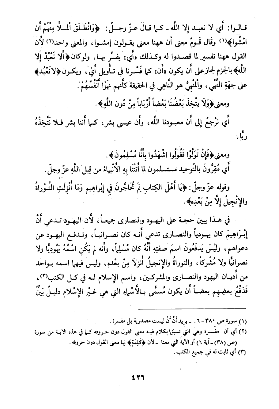 دعواهم، وليْسَ يَدفَعُونَ اسمَ صفتِهِ أنهُ كان مُسْلِماً، وأنه لم يَكنِ اسْمُهُ يَهُودِيا ولا نصرانيا ولا مُشْركاً، والتوراةُ والإنجيلُ أنزلَا مِنْ بعْدهِ؛ وليس فيهما اسمه بواحد من أديان إليهود والنصارى والمشركين، واسم الإسلام له في كل الكتب؛ فَدَفْعُ بعضِهِم بعضاً أن يكون مُسمَّى بالاسْماء التي هي غيْر الإسْلام دليل بَينٌ