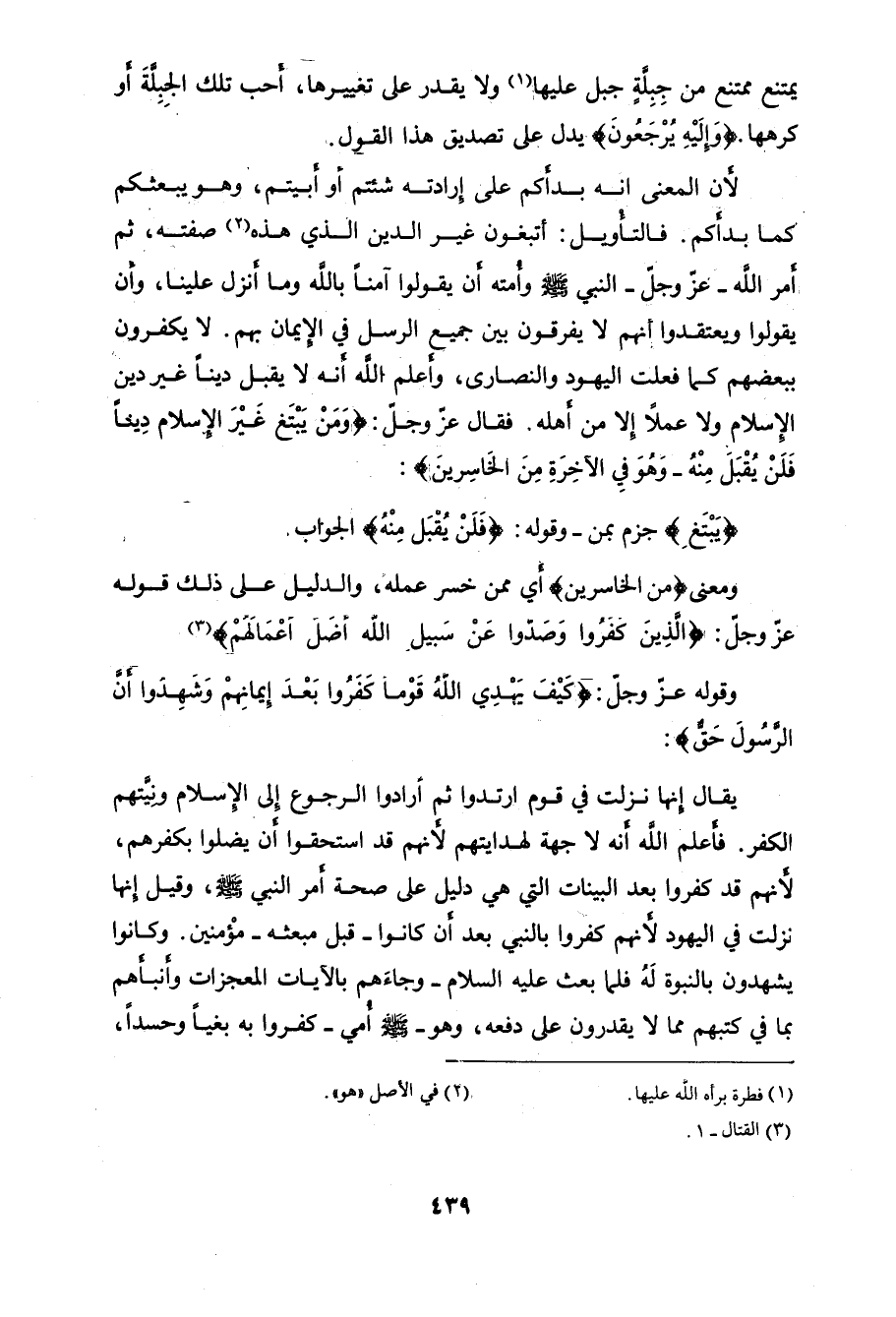 فقال عز وجلَّ: (وَمَنْ يَبْتَغِ غَيْرَ الْإِسْلَامِ دِينًا فَلَنْ يُقْبَلَ مِنْهُ وَهُوَ فِي الْآخِرَةِ مِنَ الْخَاسِرِينَ (85)