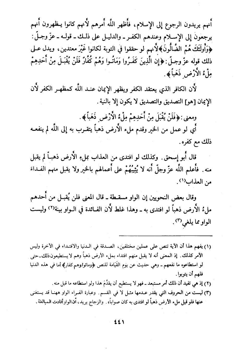ذلك قوله عزَّ وجلَّ: (إِنَّ الَّذِينَ كَفَرُوا وَمَاتُوا وَهُمْ كُفَّارٌ فَلَنْ يُقْبَلَ مِنْ أَحَدِهِمْ مِلْءُ الْأَرْضِ ذَهَبًا وَلَوِ افْتَدَى بِهِ أُولَئِكَ لَهُمْ عَذَابٌ أَلِيمٌ وَمَا لَهُمْ مِنْ نَاصِرِينَ (91)