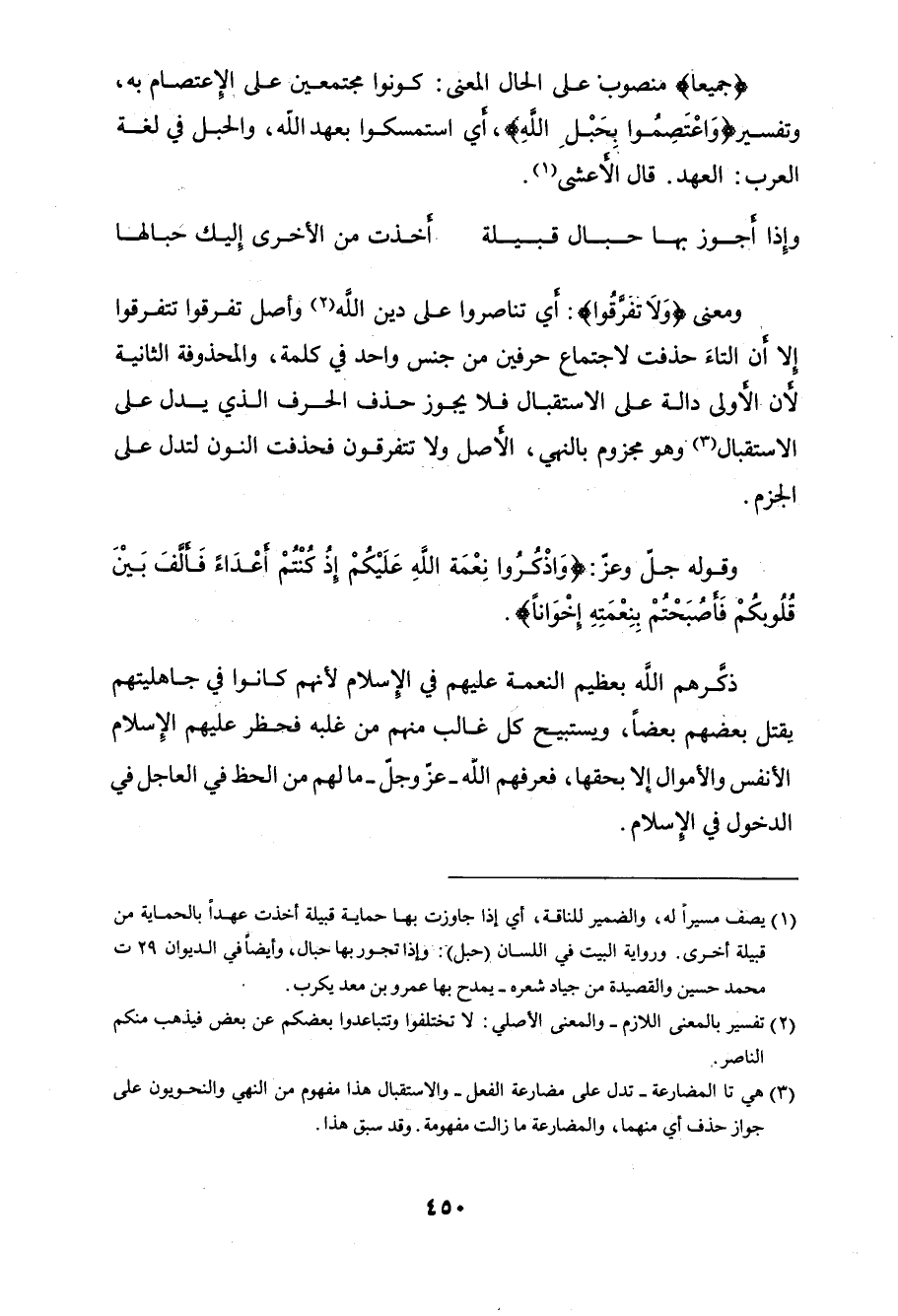 ومعنى (وَلَا تَفَرَّقُوا): أي تناصروا على دين الله وأصل تفرقوا تتفرقوا