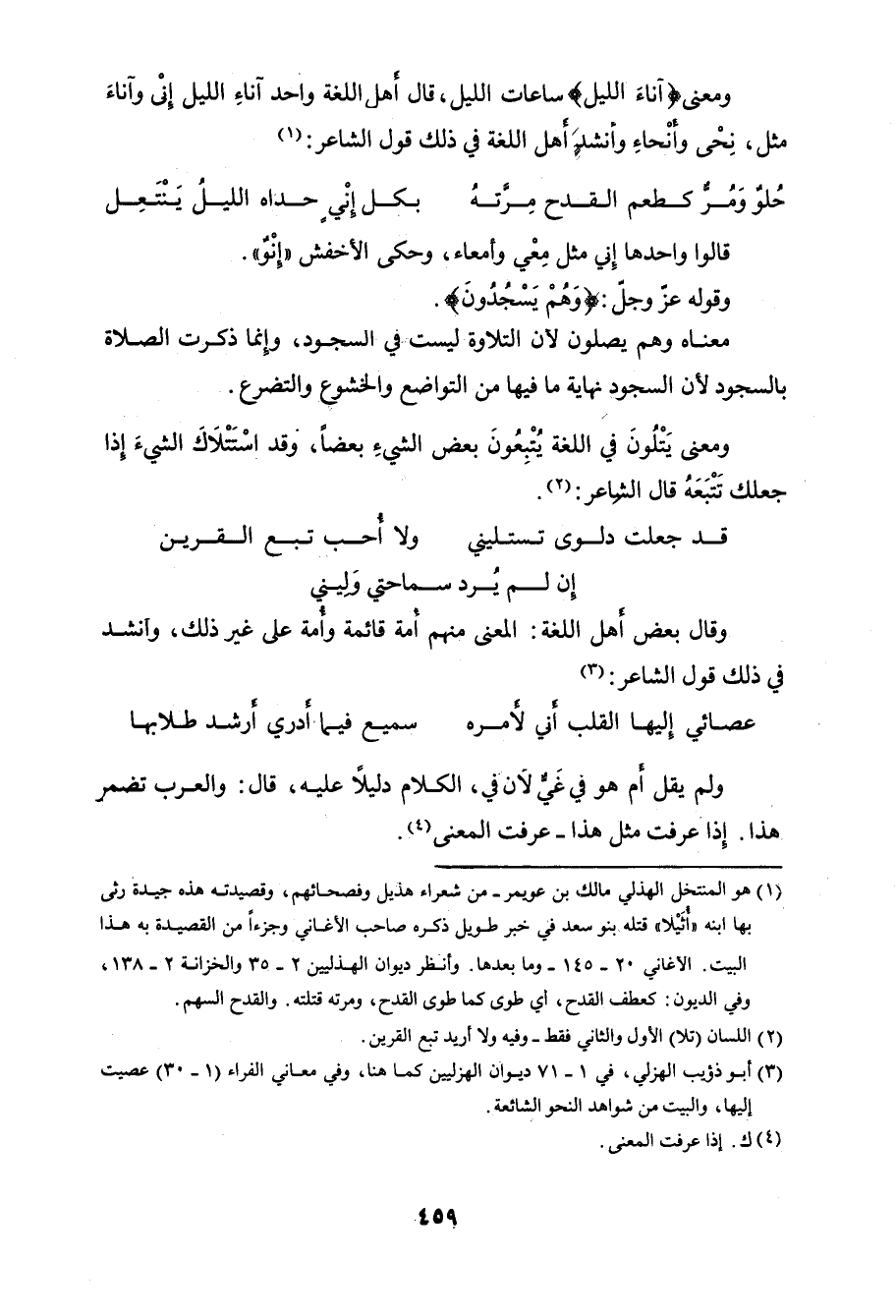 ومعنى (آناءَ الليل) ساعات الليل، قال أهل اللغة واحد آناءِ الليل إنْي وآناءَ