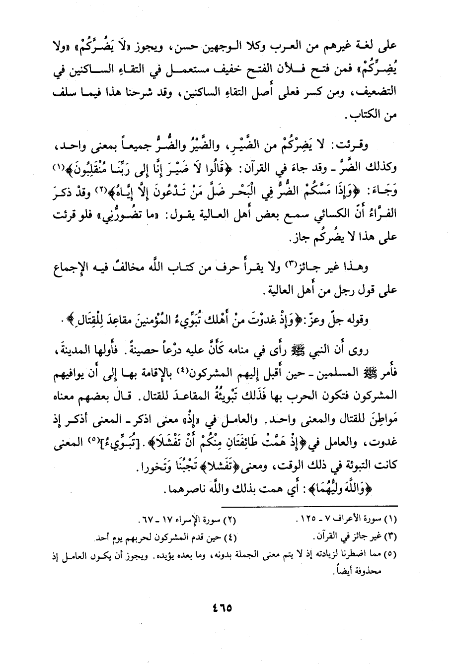 على لغة غيرهم من العرب وكلا الوجهين حسن، ويجوز (لَا يَضُرُّكُمْ) (ولا يُضِركُمْ) فمن فتح فلأن الفتح خفيف مستعمل فى التقاءِ السَّاكنين في