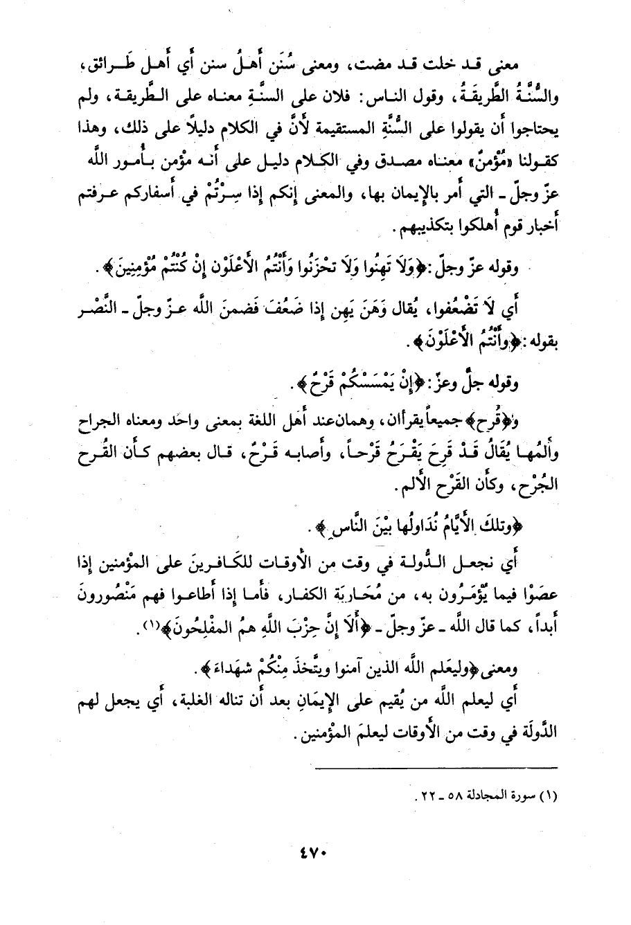 وقوله جلَّ وعزَّ: (إِنْ يَمْسَسْكُمْ قَرْحٌ فَقَدْ مَسَّ الْقَوْمَ قَرْحٌ مِثْلُهُ وَتِلْكَ الْأَيَّامُ نُدَاوِلُهَا بَيْنَ النَّاسِ وَلِيَعْلَمَ اللَّهُ الَّذِينَ آمَنُوا وَيَتَّخِذَ مِنْكُمْ شُهَدَاءَ وَاللَّهُ لَا يُحِبُّ الظَّالِمِينَ (140)